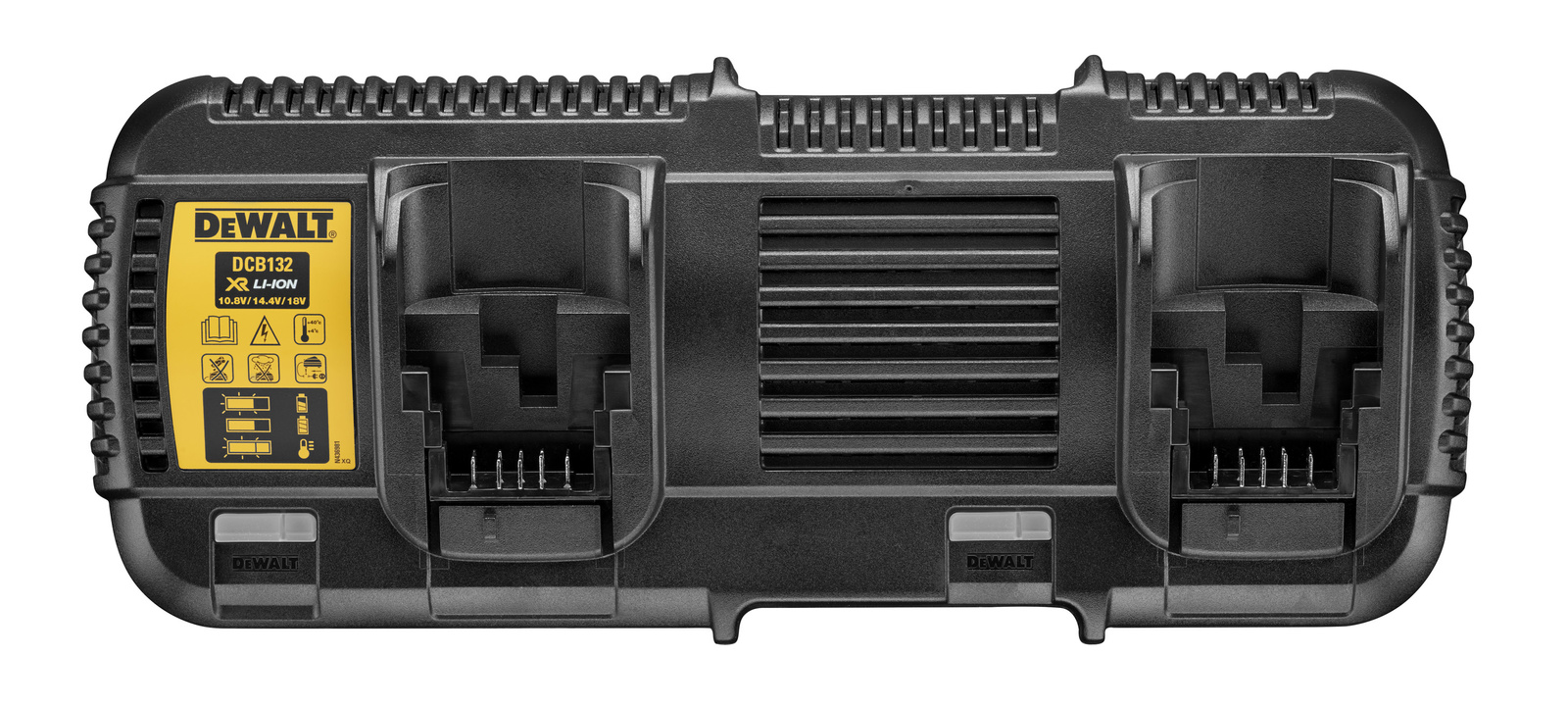 Ładowarka dwuportowa Flexvolt 54V i XR 10,8/14,4/18V DCB132 Dewalt pozwala w efektywny sposób ładować różne akumulatory wsuwane Dewalt, które pochodzą z serii XR Li-Ion o napięciu 10,8 V-18 V oraz Flexvolt 54 V. Dzięki konstrukcji z dwoma portami ładującymi można równocześnie ładować dwa akumulatory 18 V prądem 4 A – na każdym porcie.