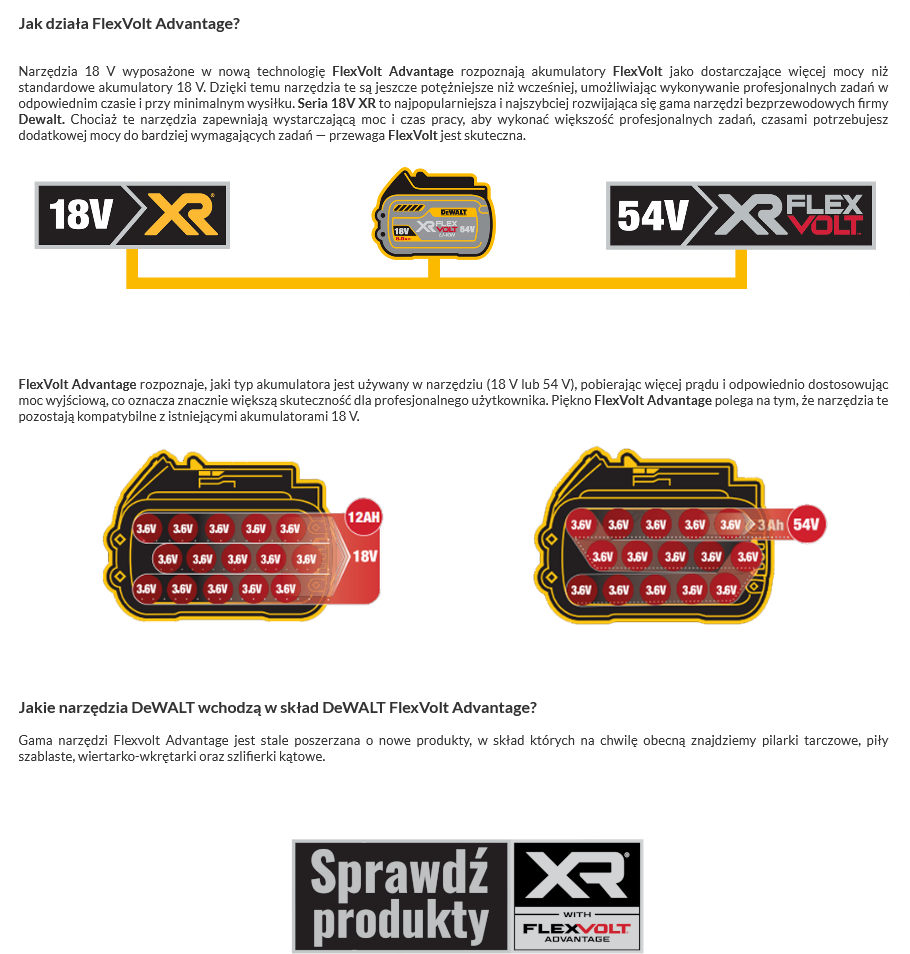 - 42% więcej mocy przy użyciu akumulatora DCB546 XR FLEXVOLT 6 Ah w porównaniu z DCB184 18 V XR 5 Ah