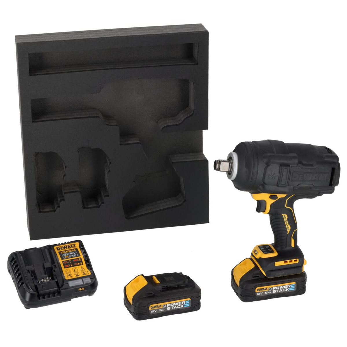 Klucz udarowy Dewalt DCF964H2G to nowy, bezprzewodowy klucz udarowy Dewalt z silnikiem bezszczotkowym i zasilaniem akumulatorowym z serii Dewalt 18V. Narzędzie to wyposażone zostało w uchwyt narzędziowy 3/4" z blokadą typu "spinka". Urządzenie oferuje bardzo duży maksymalny moment obrotowy, osiągający wartość do 1900 Nm oraz maksymalny moment zrywający sięgający nawet 2584 Nm. Częstotliwość pracy udaru tego modelu wartość do 2050 uderzeń na minutę. DCF964H2G to nowoczesne narzędzie akumulatorowe z innowacyjnym dotykowym panelem sterowania Impact Wrench, który oferuje do wyboru użytkownika 3 biegi oraz jeden dodatkowy, specjalny tryb. Prędkość obrotowa narzędzia w zależności od biegu osiąga wartość od 0 do 440/800/1200 obrotów/minutę (na biegu I, II i III). Klucz udarowy Dewalt DCF964H2G to nowy klucz udarowy, bliźniaczy model DCF961H2G w wersji z uchwytem roboczym o rozmiarze 3/4". Narzędzie w oferowanym wariancie w wyposażenia DCF964H2G-QW dostarczane jest wraz z zestawem zasilającym, z dwoma, olejoodpornymi akumulatorami PowerStack, o pojemnosci 5,0 Ah każdy, wraz z uniwersalną ładowarką, piankowym wkładem do szuflad narzędziowych oraz gumową osłoną narzędzia.
