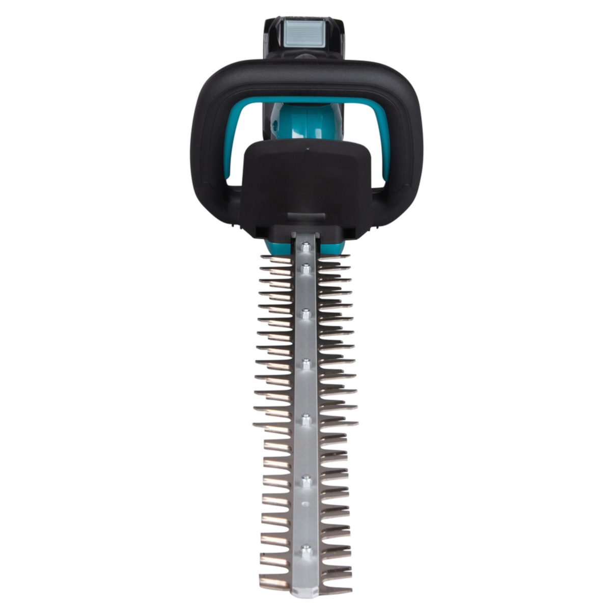 Nożyce wyposażone są w kontrolkę stanu naładowania akumulatora oraz system anty-restart, który zapobiega przypadkowemu uruchomieniu urządzenia. Wymienne ostrze o długości 600 mm pozwala na precyzyjne przycinanie żywopłotów, a ergonomiczna konstrukcja minimalizująca wibracje zapewnia wygodę użytkowania nawet podczas długiej pracy.
