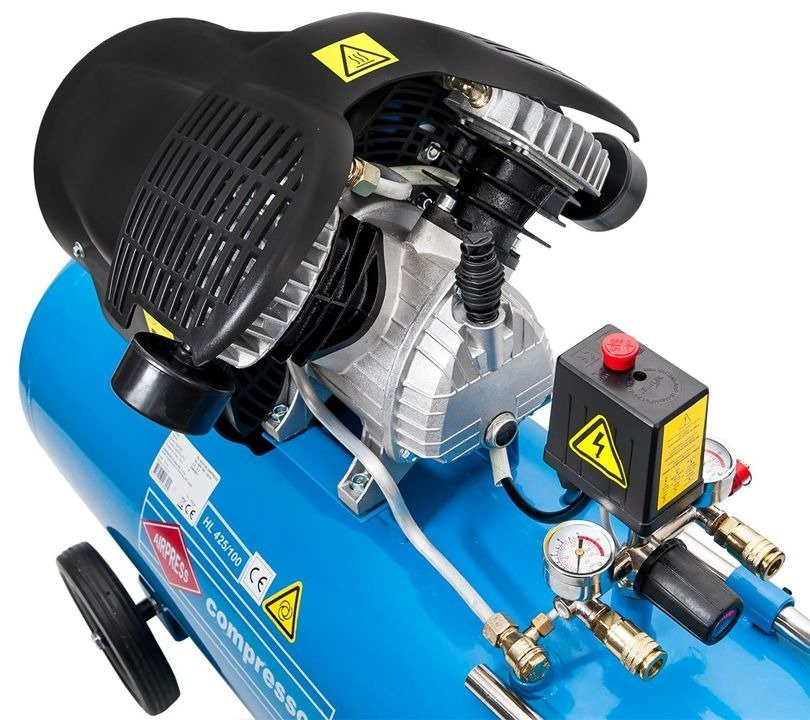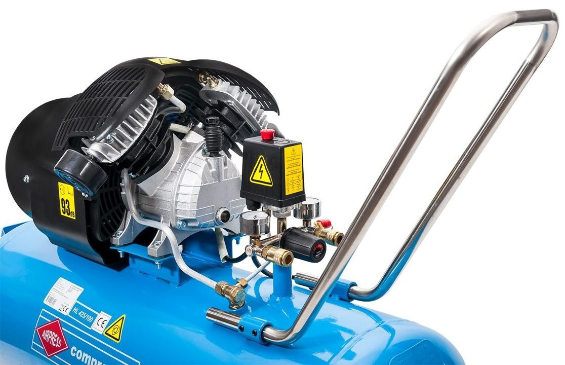 Kompresor dwutłokowy Airpress HL 425-100V to olejowa sprężarka mobilna do prac domowych i warsztatowych. Dwa tłoki i napęd bezpośredni 1:1 zapewniają dobrą wydajność przy prostej obsłudze, a zbiornik 100 l ogranicza częstotliwość załączeń samego urządzenia. Maksymalne ciśnienie 8 bar i efektywna wydajność na wyjściu 260 l/min pozwalają zasilać typowe narzędzia pneumatyczne. Konstrukcja jest przystosowana do zasilania 230 V, ma dwa uniwersalne szybkozłącza oraz koła i uchwyt do łatwego transportu.