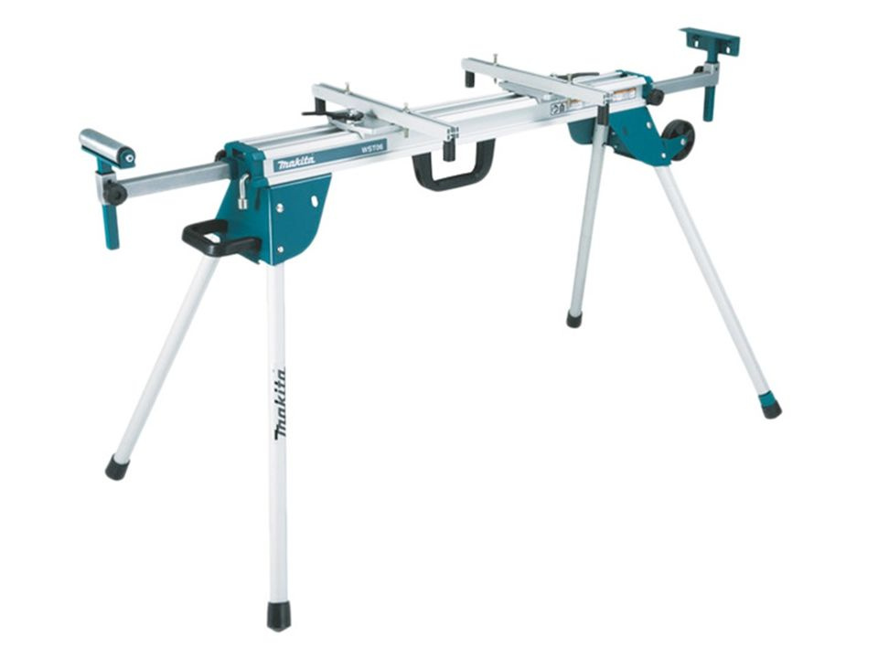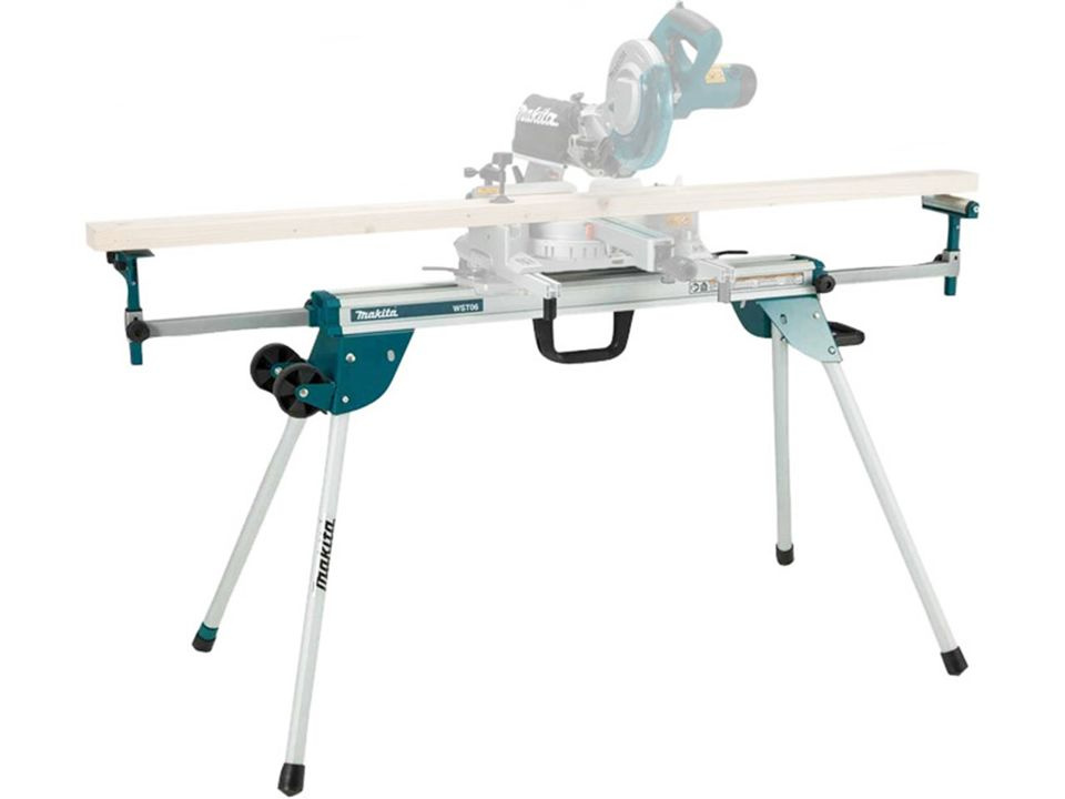 - Stół roboczy do ukośnicy Makita DEAWST06, regulowana szerokość: 2550 mm, z kółkami transportowymi, solidny, wykonany z aluminium.