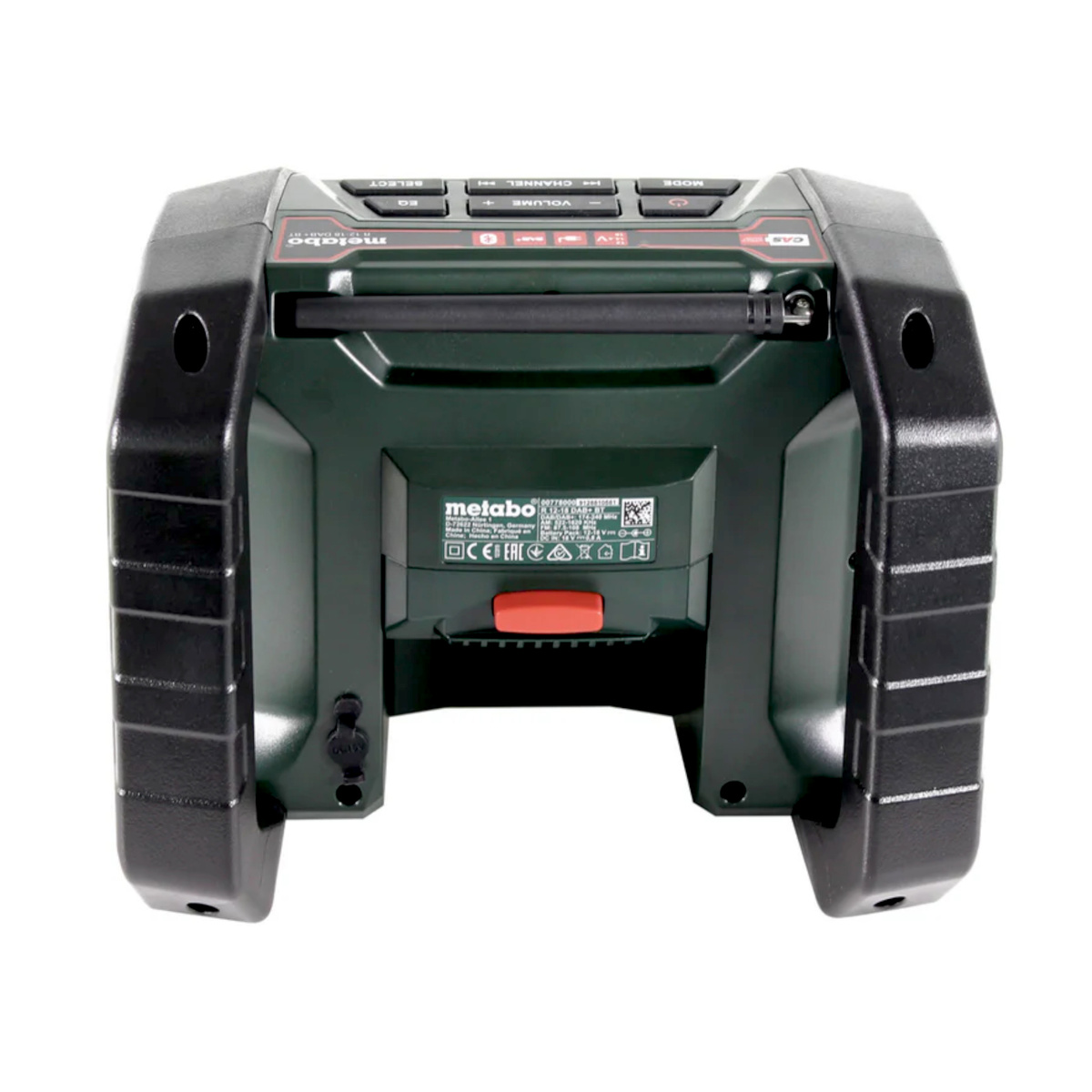 - Radio budowlane Metabo R 12-18 DAB+ BT 600778850 Funkcją Bluetooth do bezprzewodowego słuchania muzyki ze smartfonu lub tabletu, zasilanie dowolnymi akumulatorami wsuwanymi Metabo od 12 do 18 V lub bezpośrednio z sieci elektrycznej. Elastyczna antena