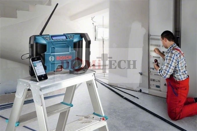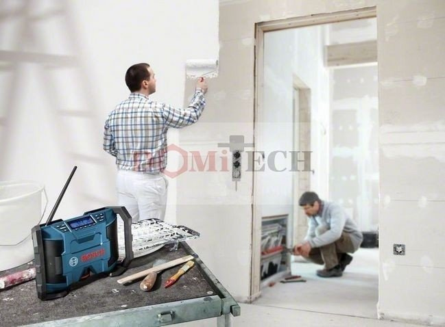- Radio budowlane Bosch GPB 12V-10 Professional 0601429200 jest zasilane poprzez akumulator Li-Ion lub zasilacz.