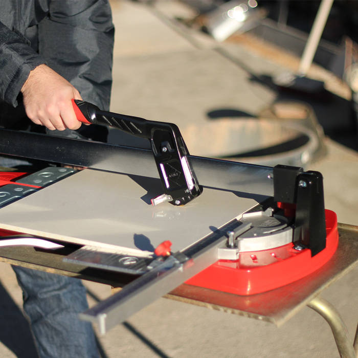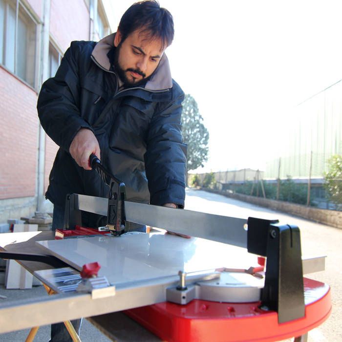 - Siła nacisku podczas pracy sięga do 1000kg, pracuje się poprzez pniecie do przodu gwarantuje to precyzyjne oraz szybkie przecinanie płytek o grubości 5-20mm