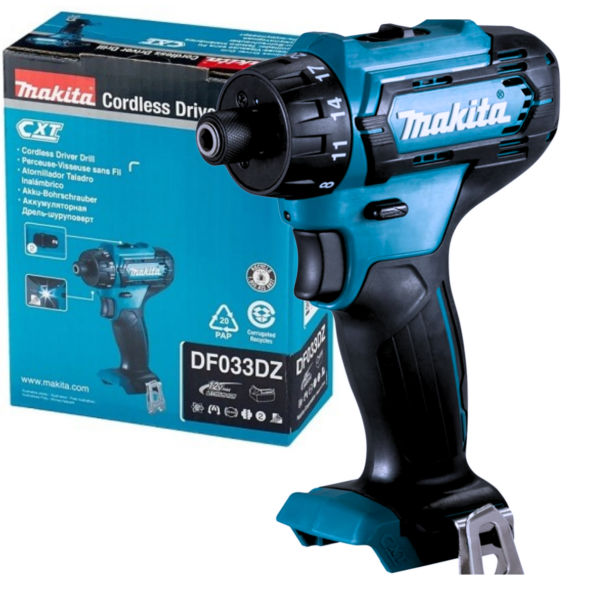 • Zakrętarka Makita DF033DZ, 2-biegowa, ultra lekka wiertarko-wkrętarka, Napięcie: 10.8V / 12V max, Technologia CXT - Compact Extreme Technology