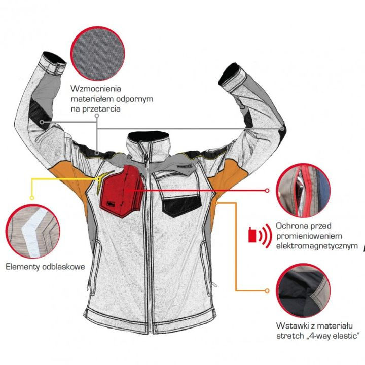 - Posiada pięć funkcjonalnych kieszeni, z czego aż trzy zamykane na suwak oraz wstawki odblaskowe zwiększające widoczność i bezpieczeństwo podczas pracy