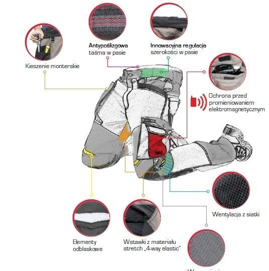 - Posiada 13 funkcjonalnych kieszeni, z czego jedna zamykana na suwak oraz wstawki odblaskowe zwiększające widoczność i bezpieczeństwo podczas pracy
