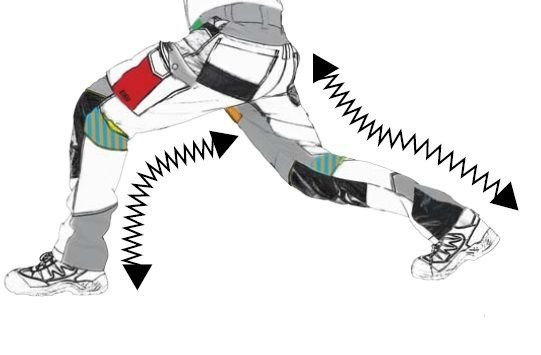 • Poprawiona wytrzymałość dzięki zastosowaniu specjalnych wstawek z materiału stretch - 4-way elastic. Materiał ten jest bardzo elastyczny, wytrzymały, wodoodporny oraz wiatroszczelny