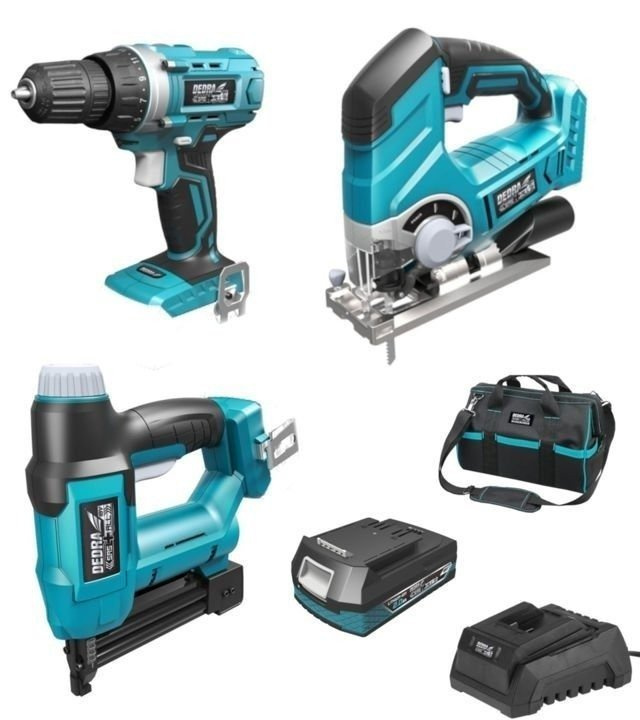 Akumulatorowa wiertarko-wkrętarka + akumulatorowy zszywacz 2 w 1 + akumulatorowa wyrzynarka + akumulator 2,0 Ah + ładowarka + torba Dedra DED7015