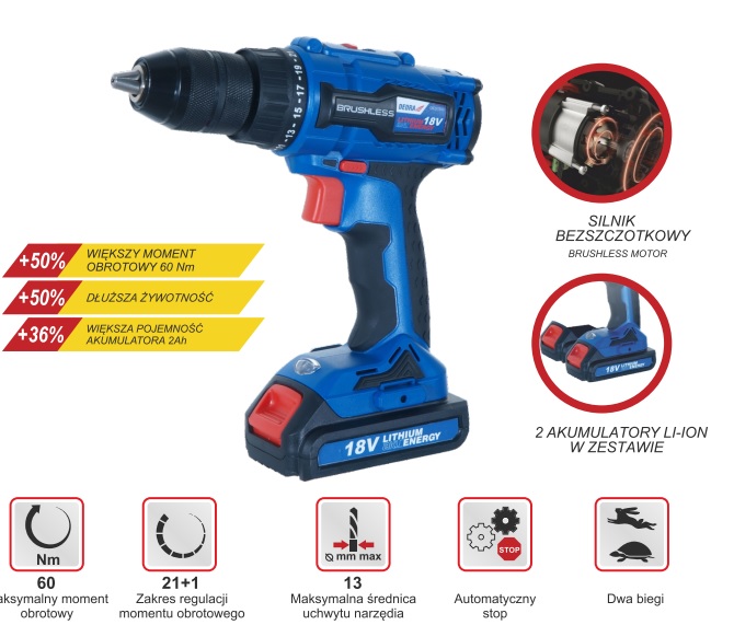 - Akumulatorowa wiertarko-wkrętarka 18 V DED7885B Dedra. Silnik bezszczotkowy. Napięcie: 18 V. Moment obrotowy: 60 Nm. Prędkość obrotowa: 0-400/ 0-1500 1/min. Zakres uchwytu: 13 mm. Miękka rękojeść. Hamulec elektryczny. 2 x akumulator Li-Ion 2 Ah.