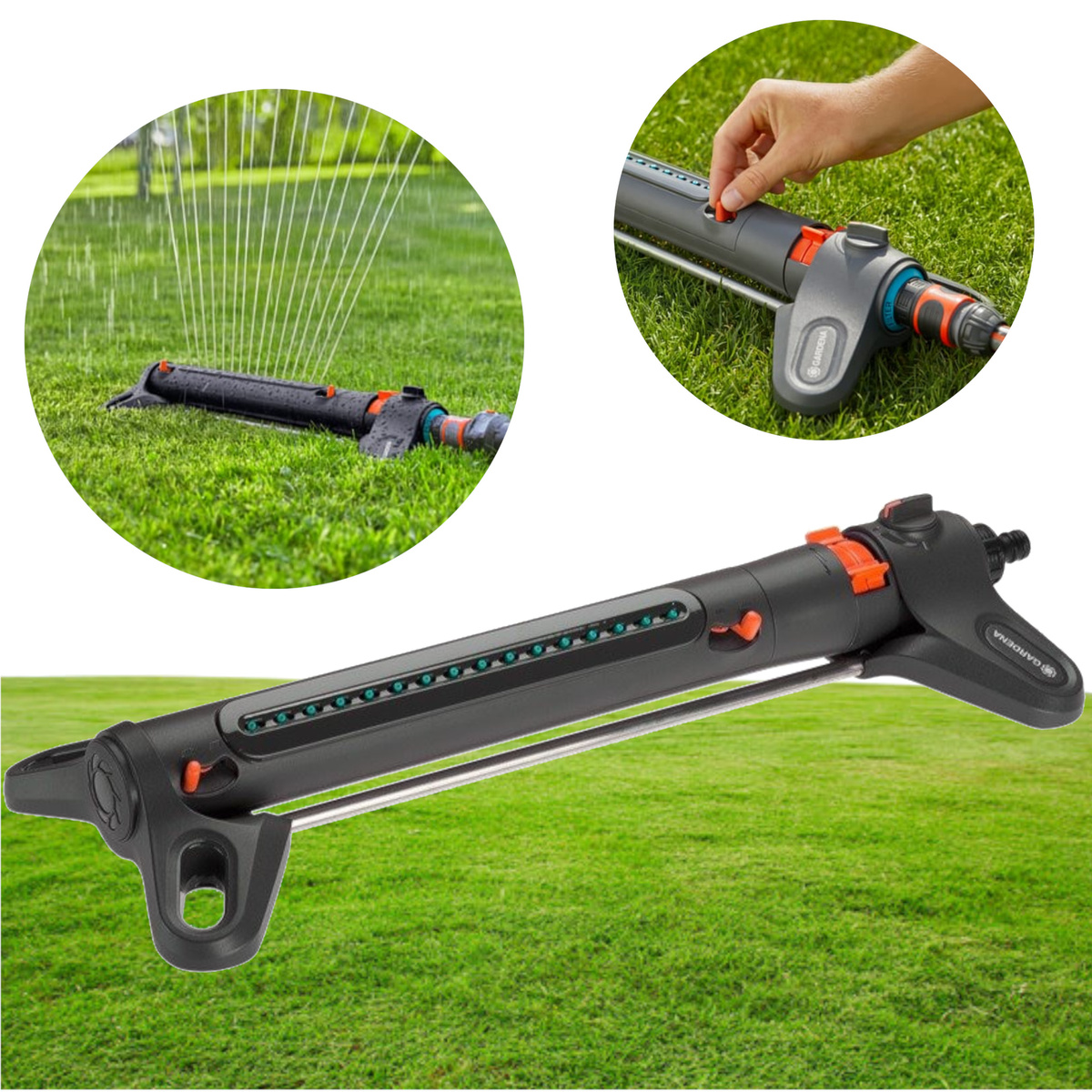 Zraszacz wahadłowy AquaZoom M 18712-20 Gardena jest przykładem na to, że trawnik może być niezwykle precyzyjnie nawadniany. Proces też ma miejsce na obszarze od 9 do 250 m². Dzięki równomierności działania nie tworzą się niepożądane kałuże. Wykorzystanie suwaka pozwala ustawić zasięg w przedziale 3-18 m, zaś szerokość zraszania z kolei wynosić może od 3 do 14 m. Możliwe jest także nawadnianie wyłącznie z prawej lub lewej strony.
