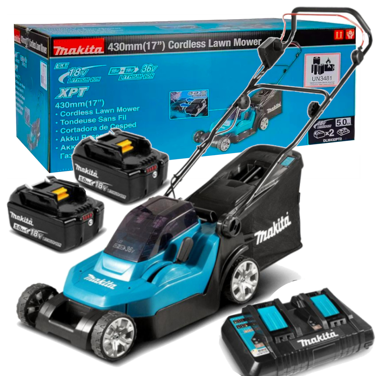 Kosiarka akumulatorowa Makita DLM432PT2 cechuje się wysoką wydajnością pracy dzięki zastosowaniu dwóch akumulatorów 18 V, które pozwalają na koszenie trawnika o powierzchni do 575 m² na jednym ładowaniu. Urządzenie posiada podwyższoną odporność na pył i wilgoć dzięki zastosowaniu technologii XPT. Elektronarzędzie zostało przystosowane do pracy w 3 funkcjach: cięcie, zbieranie i mulczowanie