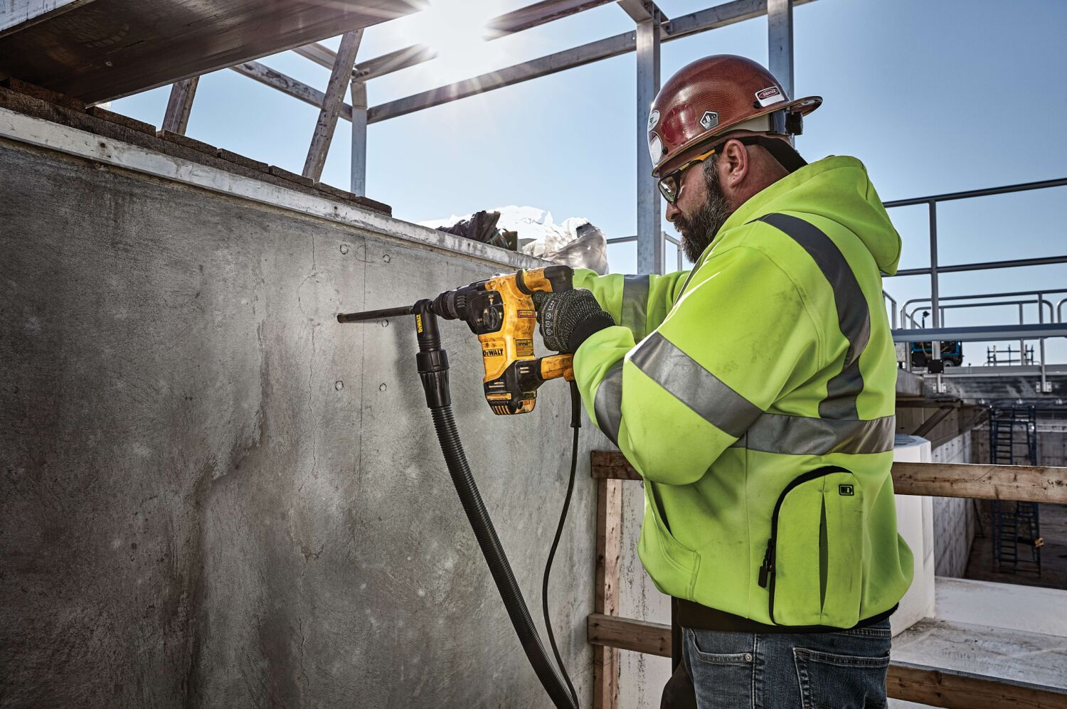 Młotowiertarka kątowa SDS-Plus Dewalt D25333K sprawdza się doskonale do wiercenia otworów pod kotwy i zamocowanie w betonie oraz murze w zakresie średnic 4-26 mm. Dzięki Aktywnemu Systemowi Kontroli Wibracji i sprężynowej rękojeści poziom drgań zostaje znacznie obniżony, usprawniając pracę i sprawiając, iż jest ona bardziej precyzyjna. Funkcja wyłączenia obrotów umożliwia operatorowi lekkie kucie w takich materiałach, jak cegła, miękki mur lub miękki beton, natomiast wyłącznie udaru pozwala na wiercenie w drewnie i metalu oraz daje możliwość prowadzenia prac wkrętarskich. Narzędzie zostało wyposażone w duży mechanizm pneumatyczny o średnicy 22 mm, który zapewnia komfortowe warunki pracy, przy jednoczesnym ograniczeniu obciążenia najważniejszych komponentów modelu.