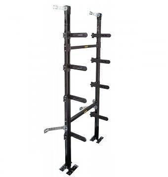 System zabudowy samochodów dostawczych DWST1-81045 DeWalt został stworzony do mocowania, magazynowania i transportowania skrzyń narzędziowych TSTak w samochodach dostawczych. Stelaż składa się z dwóch prowadnic pionowych z czterema kompletami uchwytów, dzięki którym prowadnice mogą być regulowane na wysokość w zakresie od 1463 do 2143 mm, co daje użytkownikowi możliwość dostosować ich do swoich potrzeb. Stopy i system stabilnego mocowania służą do przytwierdzenia stelaża do podłogi i ścian pojazdu.