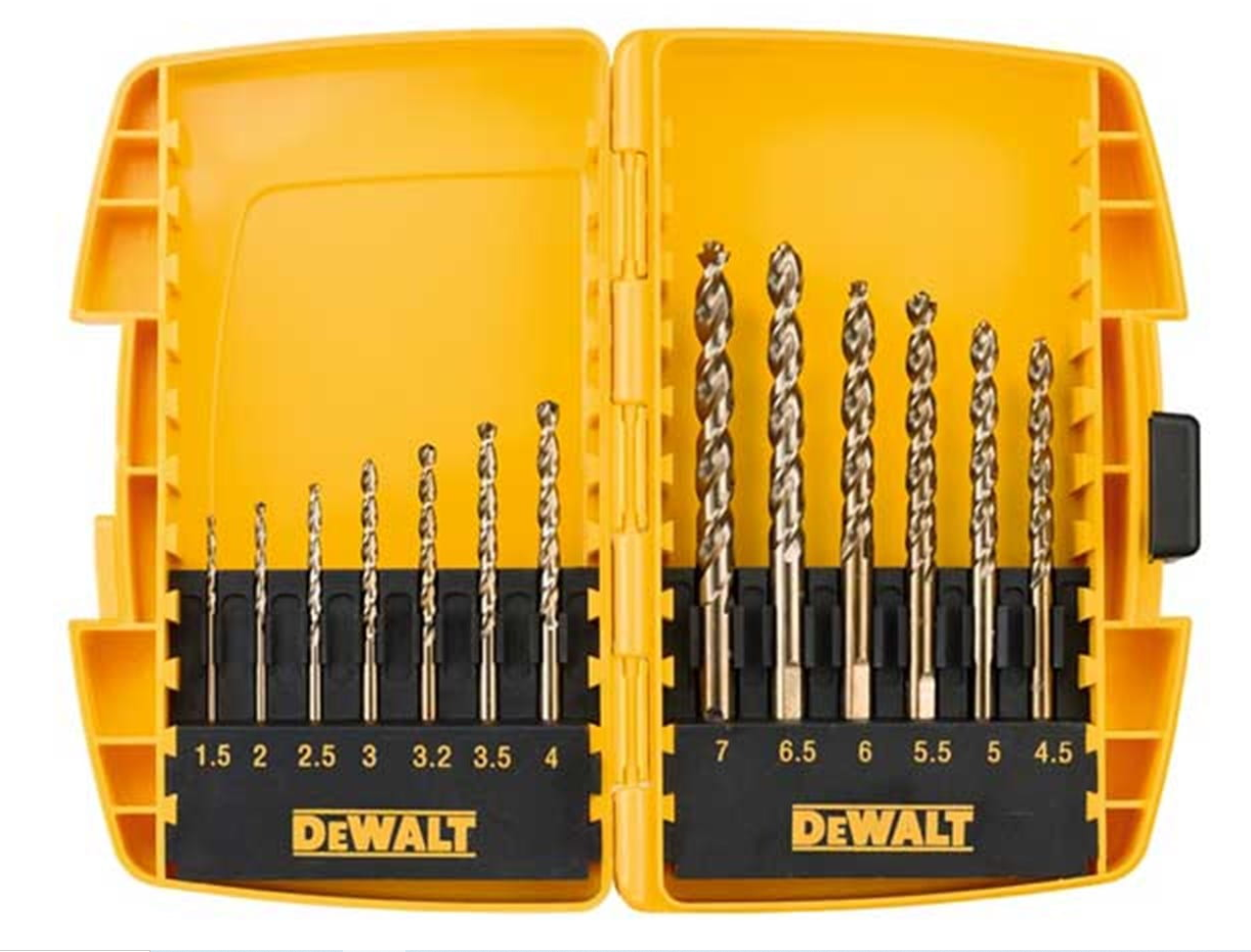 • Zestaw wierteł do metalu 13 sztuk DT7920B Dewalt: Wymiary (mm) 1.5, 2, 2.5, 3, 3.2, 3.5, 4, 4.5, 7 z chwytem walcowym. Wiertła: 5.5, 6, 6.5 z trzonkiem ściętym na płasko. Wykonanie: HSS. Powłoka: złota tlenkowa. Kasetka transportowa