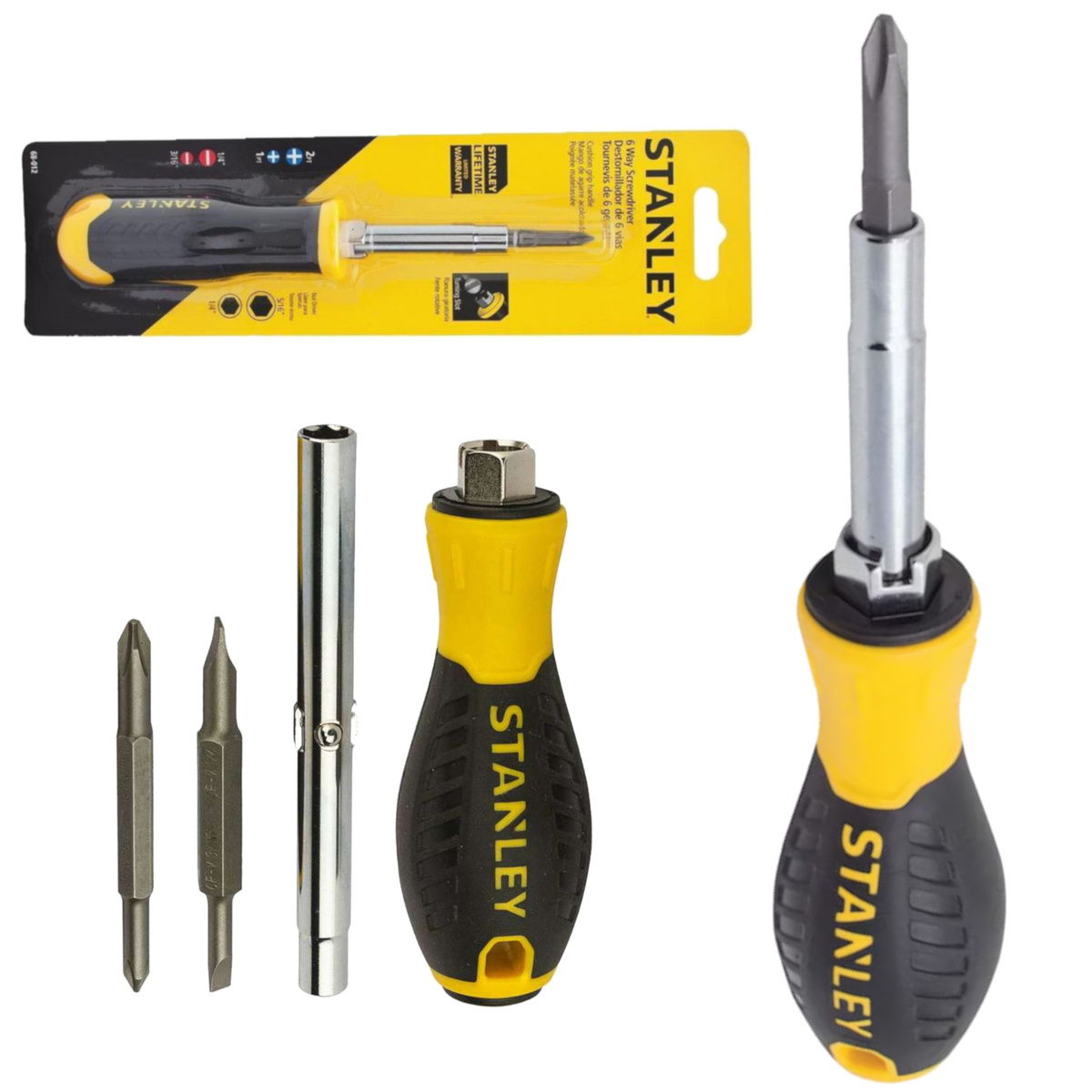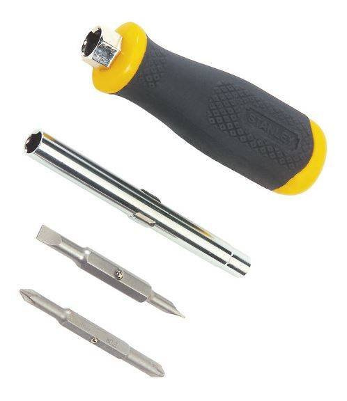 Wkrętak sześciofunkcyjny 0-68-012 Stanley wyposażony jest w bimateriałową rękojeść, dzięki której narzędzie dobrze leży w dłoni. W zestawie znajdują się wielofunkcyjne, wymienne, dwustronne końcówki, które montuje się w szybki sposób.