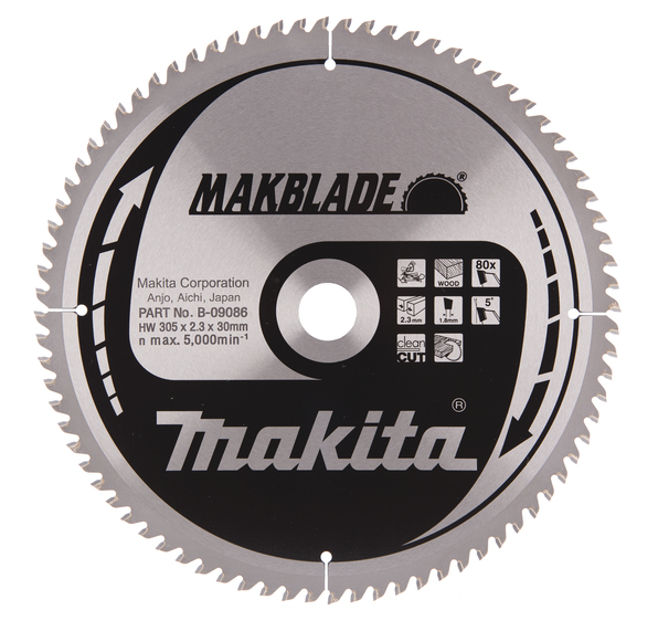 - Tarcza tnąca Makblade 305X30; 80Z, Makita. Typ: Makblade. Śr. tarczy: 305mm. Śr. otworu tarczy: 30 mm. Grubość ostrza: 2,3 mm. Grubość tarczy: 1,8 mm. Liczba zębów: 80. Kąt nachylenia zębów: 5 °. Maks. prędkość obr.: 5000obr. /min. Zastosowanie: drewno.