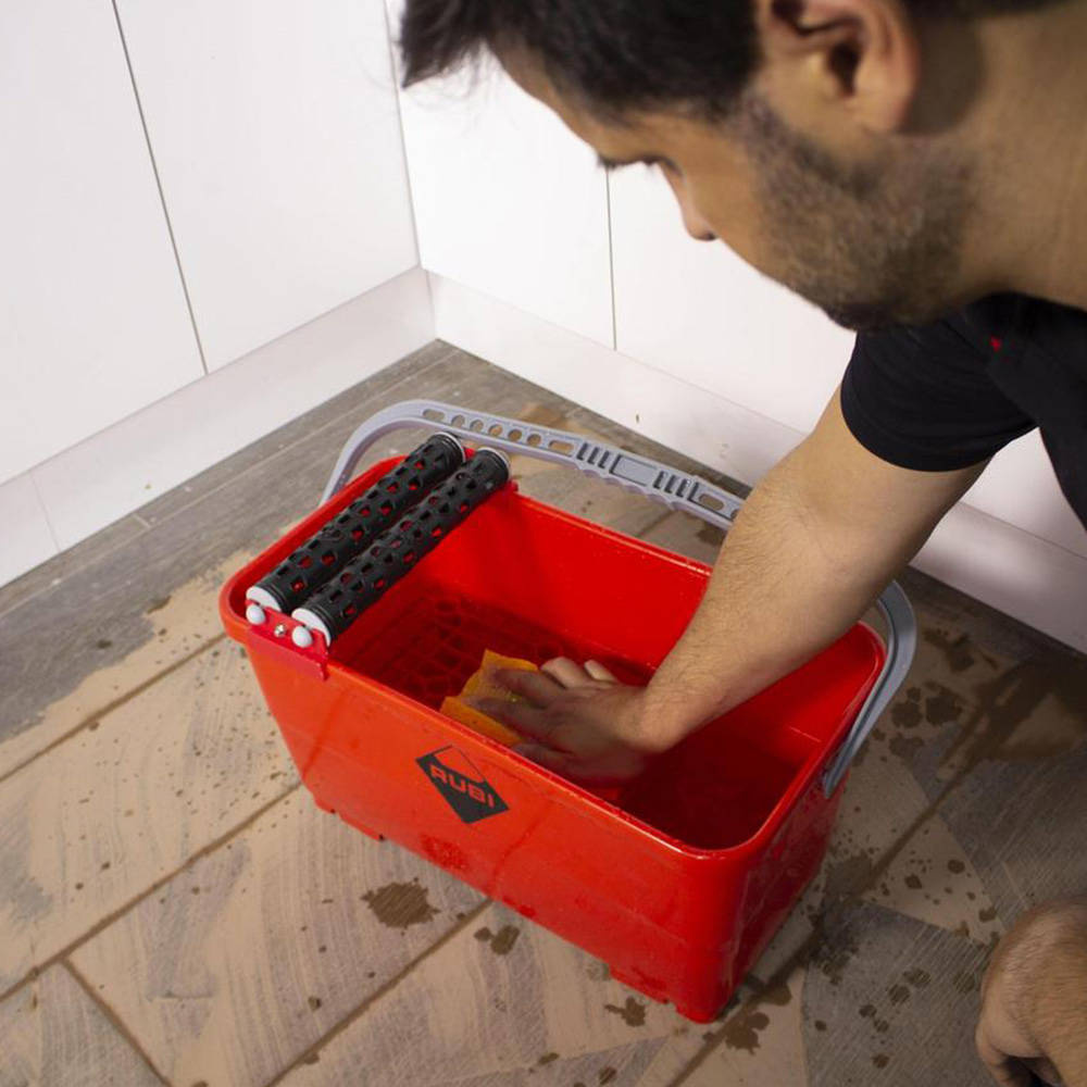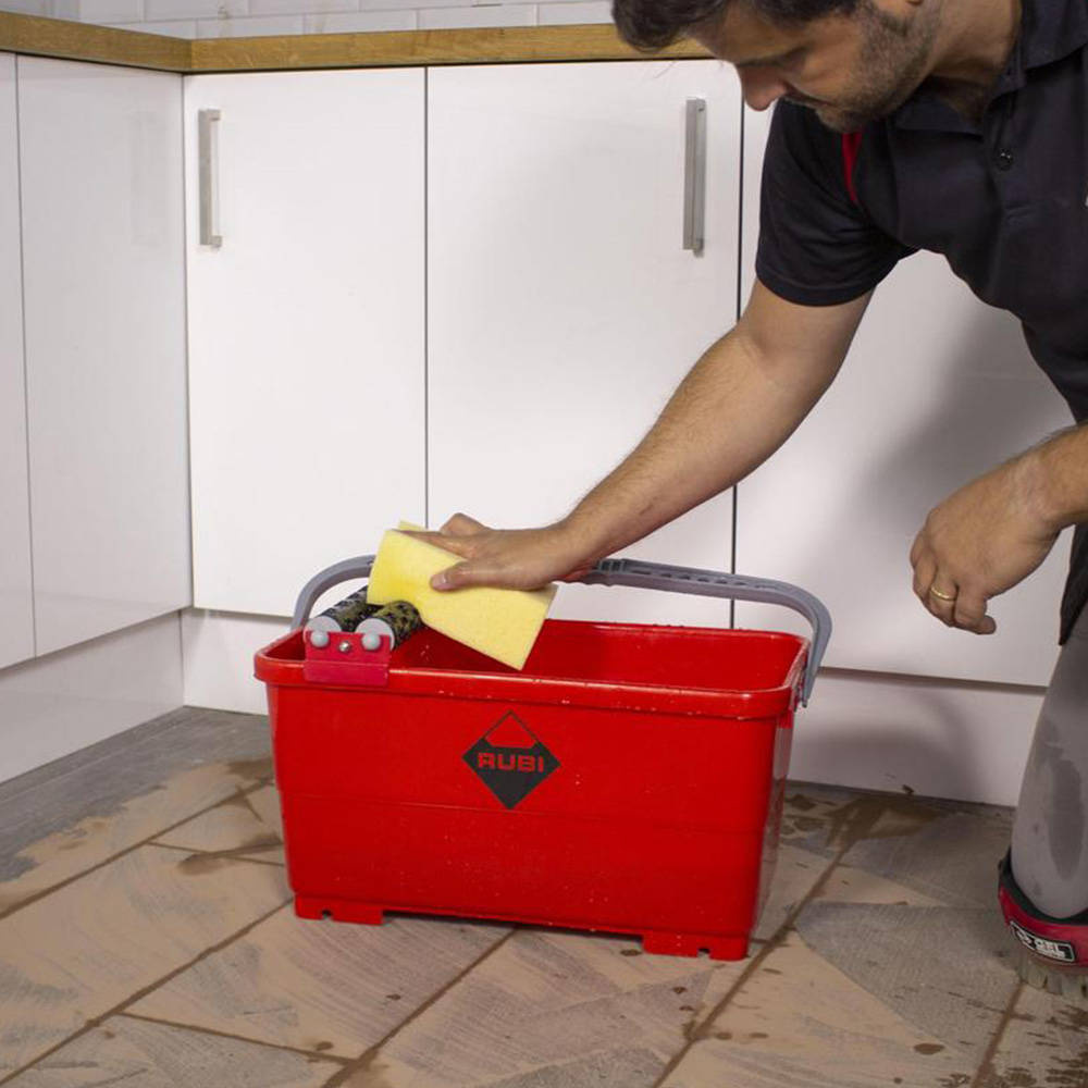 Wiadro RUBICLEAN EASYPRO 21945 Rubi służy do czyszczenia powierzchni ceramicznych na ścianach i podłogach po wykonaniu spoinowania. Dzięki wykonaniu ze specjalnego tworzywa wiadro cechuje się wysoką wytrzymałością i niską wagą, przez co komfort pracy stoi na wysokim poziomie. Kratka została wzmocniona polistyrenem HIPS, który dodatkowo zwiększa jej odporność - wydłuża to możliwości eksploatacyjne akcesorium. Na jednym z końców wiadra 21945 Rubi znajdują się dwie perforowane rolki służące do wyciskania gąbki - dodatkowe wzmocnienie rolek sprawia, że są one w stanie wytrzymać duży nacisk. Rolki wraz z kratką są łatwe w demontażu, co znacznie ułatwia czyszczenie osprzętu.