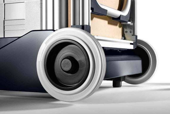 Mobilny warsztat MW 1000 Basic 203454 Festool zapewnia operatorowi łatwy transport, dzięki dużym, gumowym kółkom - są one odporne na wstrząsy, przez co przewożeniu warsztatu nie towarzyszą niekomfortowe drgania. Uchwyt z możliwością zmiany nachylenia pozwala na dostosowanie go do potrzeb użytkownika, co podkreśla komfort prowadzenia działań. W wanience znajduje się zagłębienie na uchwyt, w wyniku czego stół można łatwo załadować do pojazdu. Pomimo swojej praktyczności warsztat MW 1000 Basic Festool 203454.