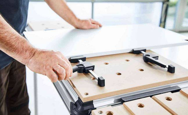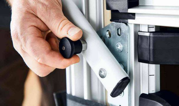 Powierzchnia roboczą i powierzchnia na akcesoria w modelu 203454 Festool ulega możliwości rozbudowy. Dodatkowy atut to możliwość łączenia urządzenia ze stołami wielofunkcyjnymi w ramach rozszerzenia jego zastosowań, a także instalacja wkładów wysuwanych do Systainera. Praca na tym elemencie jest bardzo precyzyjna, ponieważ dzięki perforowanej płycie i profilowi aluminiowemu stół jest stabilny. Dla wygody obsługującego mobilny warsztat MW 1000 Basic 203454 Festool gwarantuje elastyczne opcje zaciskania i mocowania.