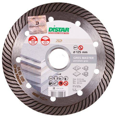Tarcza diamentowa 1A1R Gres Master 11115160009 Distar przeznaczona została do cięcia wytrzymałych płytek gresowych odpornych na mróz i ścieranie, których grubość wynosi 14 mm i 20 mm, bez palenia się, zatrzymywania się i deformowania tarczy. Rowki turbinowe warstwy diamentowej są ewolwentowe, dzięki czemu bardzo łatwo wgryzają się w twardy materiał i chłodzą strefę cięcia. Tarcza 11115160009 Distar świetnie radzi sobie także ze zwykłymi płytkami, tnąc je z duża prędkością.