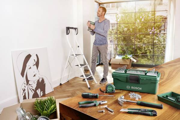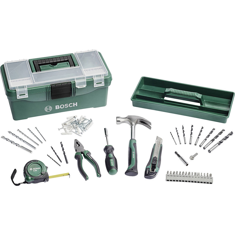 Zestaw narzędzi Bosch 2607011660 - 73 elementy to zestaw narzędzi podstawowego wyposażenia niezbędnego w każdym gospodarstwie domowym. W skład zestawu wchodzą wiertła do drewna, metalu i muru, nóż, taśma, młotek, wkrętak ręczny z bitami, pogłębiacz, śruby i kołki. Całość zestawu dopełnia pudełko do przechowywania wraz z wkładką wewnętrzną.