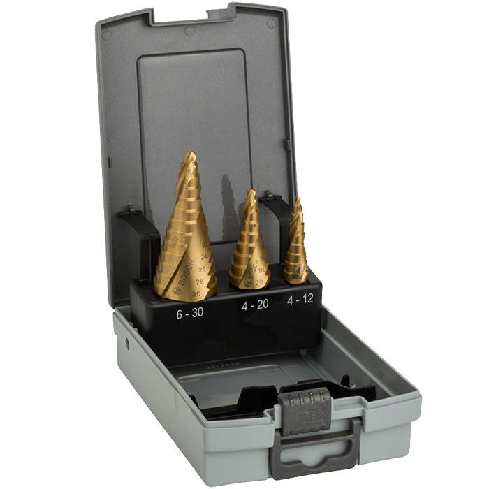 3-częściowy zestaw wierteł stopniowych HSS-TiN BOSCH 2608587432 składa się z trzech wierteł do stopniowych z rowkiem wiórowym, do metalu, których długości wynoszą 66.5 mm, 70.5 mm i długość: 93.5 mm, a średnice mieszczą się w zakresie od 4 do 30 mm (od 9 do maksymalnie 13 stopni). Wiertła HSS-TiN BOSCH 2608587432 są przystosowane do wiercenia w metalu i tworzywie sztucznym. W porównaniu do HSS, wiertła HSS-TiN BOSCH są wytrzymalsze o 25%.