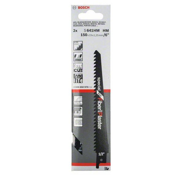 - Brzeszczot do piły szablastej Bosch S 641 HM - Bosch Carbide - zestaw 2 sztuk. Odstęp między zębami: 4,3mm.Podziałka zębów: 6 TPI.Długość całkowita: 150mm/6".Szerokość: 19mm.Grubość: 1.25mm.Kod produktu: 2608650970