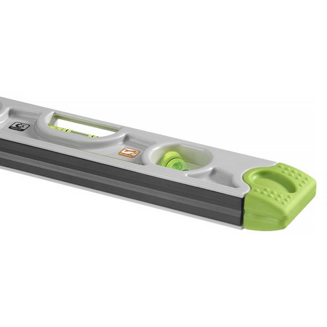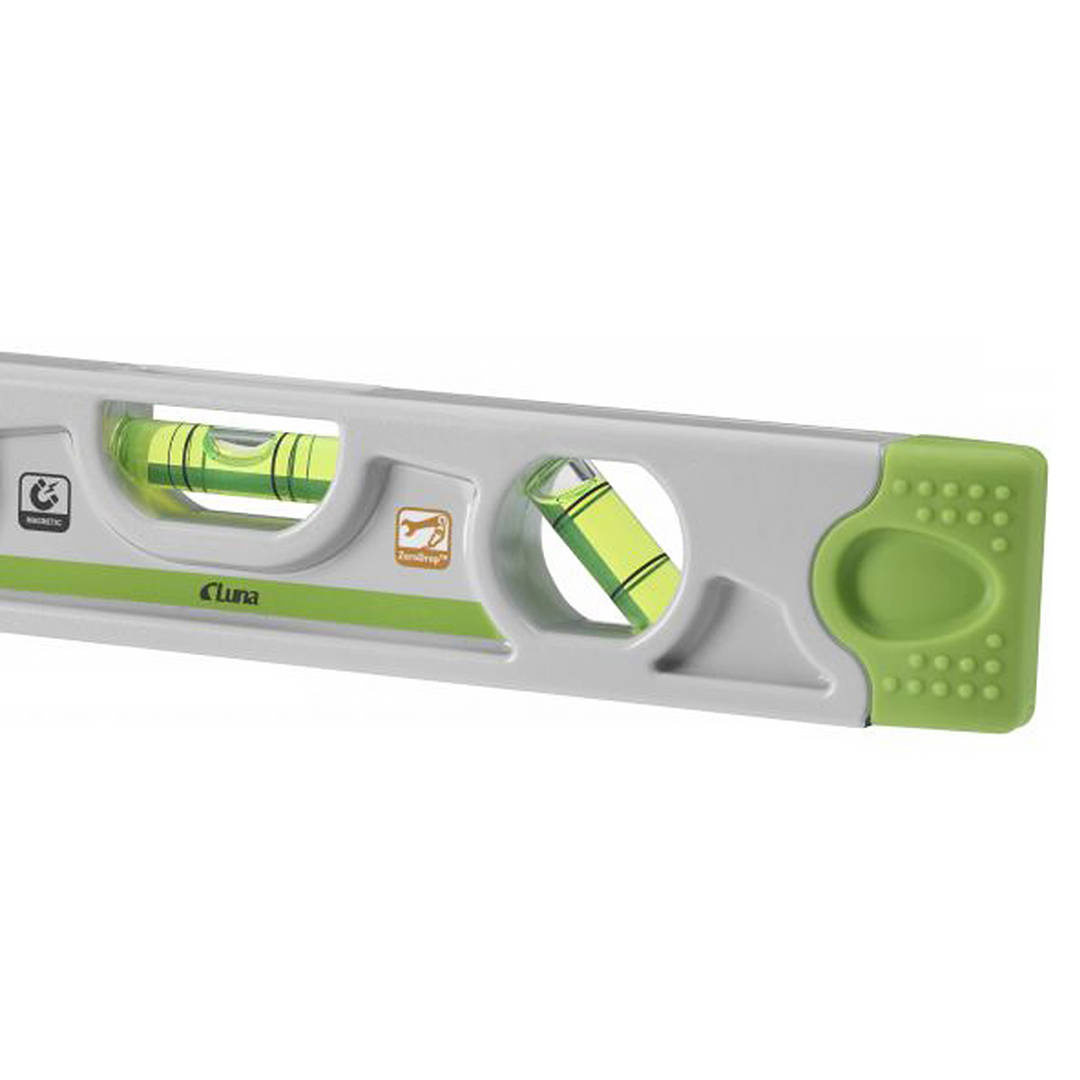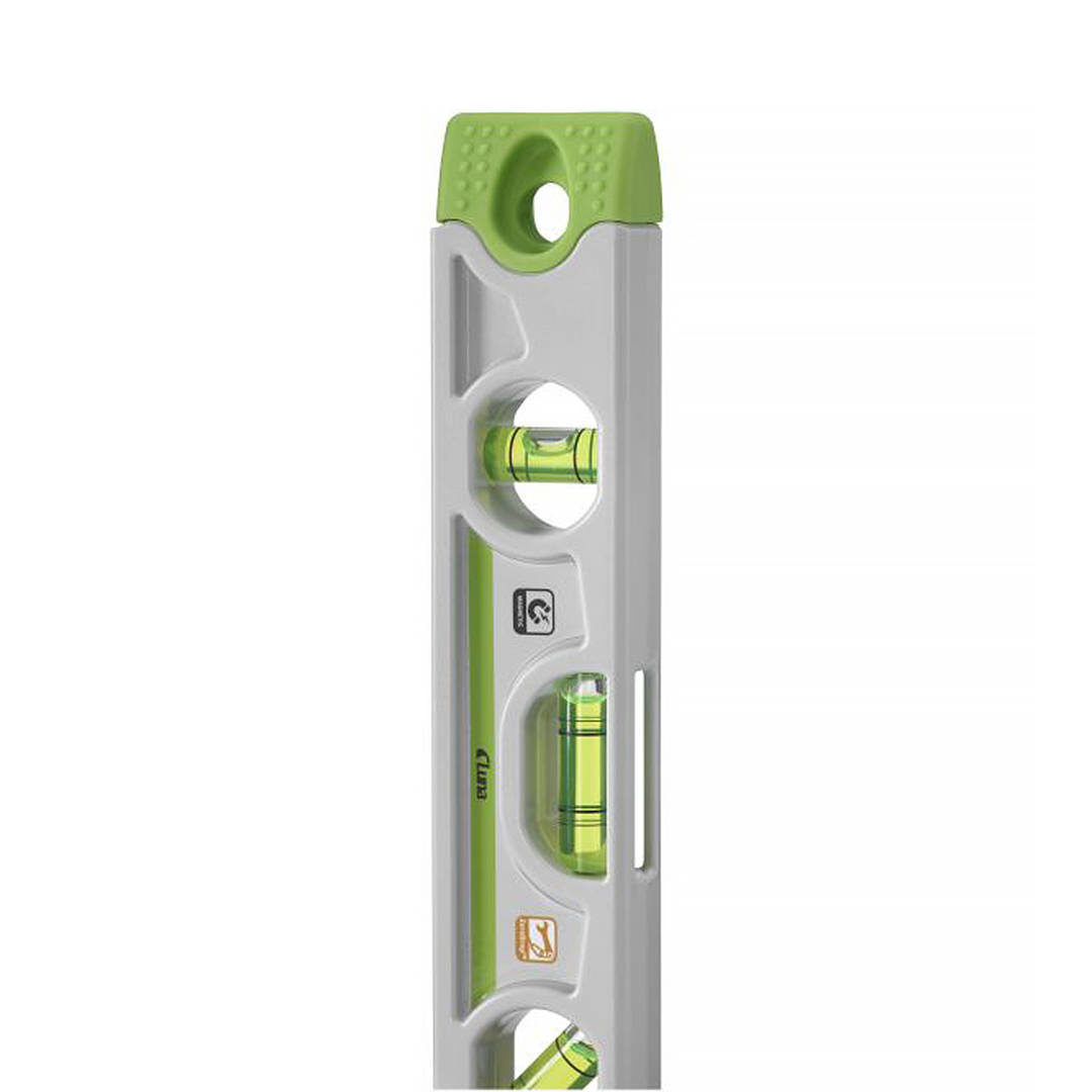 Poziomica Torpedo 23PLM LUNA 282940105 ma długość 230 mm (23 cm), jest formowana wtryskowo z tworzywa ABS i posiada wyżłobienie V dla lepszego dopasowania do rur. Torpedo 25PLM LUNA ma 3 ampułki 0°, 45°, 90°, magnes w podstawie i otwór do dołączenia zabezpieczenia narzędzia.