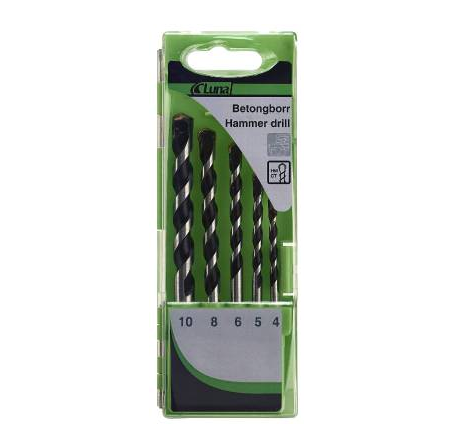 • Zestaw wierteł do betonu 5 elementów 232160101 LUNA. Wiertła z wierzchołkiem z węglików spiekanych. Do wiercenia w betonie, kamieniu, cegłach, marmurze, ceramice itd. Zestaw wierteł 10, 8, 6, 5, 4 z wygodnym etui.