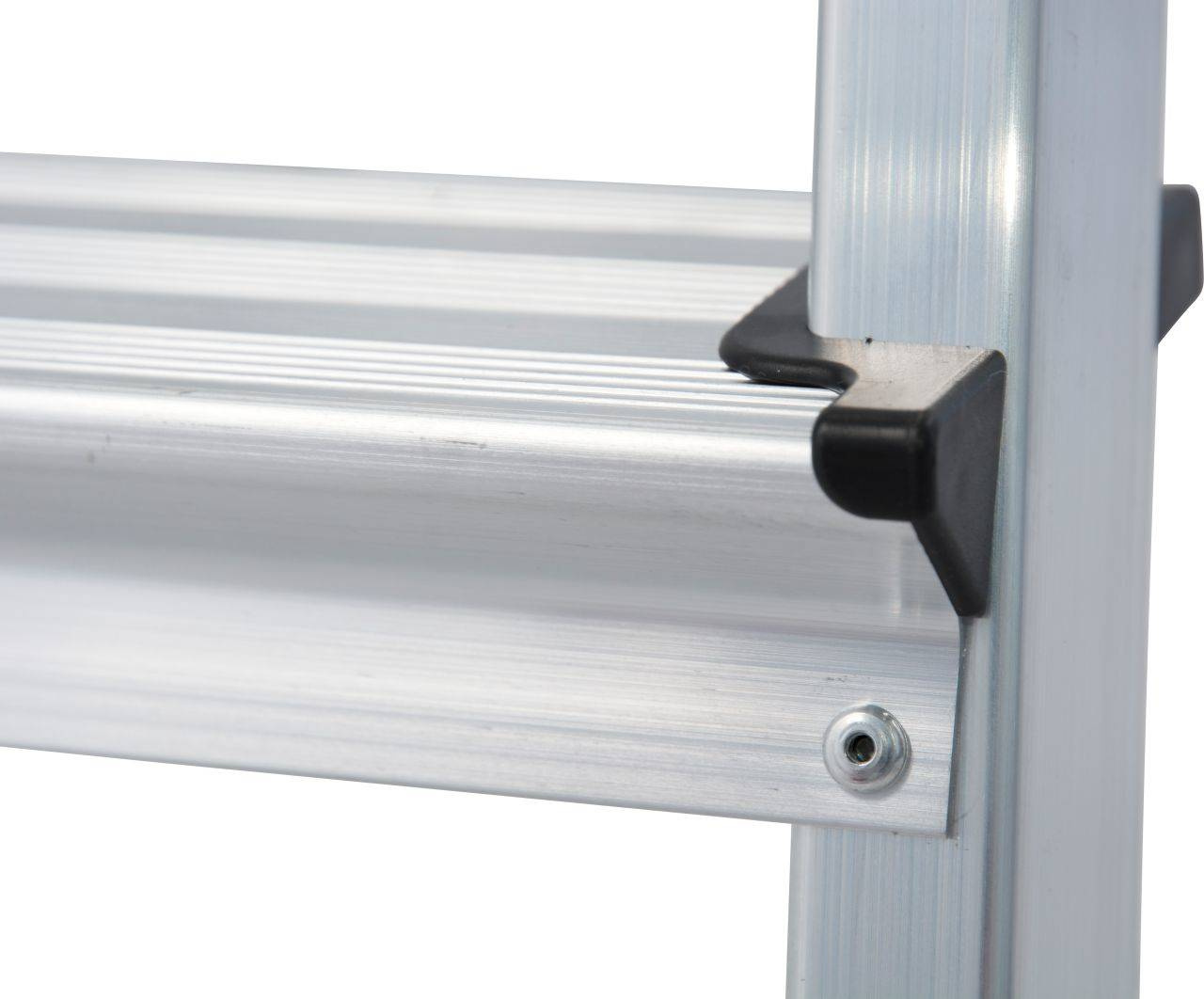 Drabina wolnostojąca SAFETA 8 KRAUSE 126368 to konstrukcja idealna. Wysokość robocza 3,70 m pozwala na zerwanie soczystych owców z czubków drzew,przyłożenie wałka malarskiego do najwyższych partii ścian, czy przysłonięcie witryn eleganckimi zaciemniającymi zasłonami. Duża ergonomiczna półka pomieści niezbędny zestaw narzędzi, dodatkowe elementy takie, jak hak na wiadro i dwa uchwyty na kabel mają na celu wygodną obsługę. Profilowana platforma o głębokości 250 mm z antypoślizgowymi nakładkami zapewnia bezpieczne użytkowanie. KRAUSE 126368 wyposażono w obejmujące podłużnice przeguby z tworzywa sztucznego (4CS). Ryflowane, antypoślizgowe stopnie o głębokości 80 mm gwarantują swobodne postawienie stopy, sprawne poruszanie się po całej płaszczyźnie szczebli. 6-nitowe połączenie stopni z podłużnicami usztywnia konstrukcję, daje poczucie bezpieczeństwa i stabilnej postawy. Drabina wolnostojąca SAFETA 8 to także antypoślizgowe stopki które zapobiegają niekontrolowanym przesunięciom narzędzia, osłaniają podłoże zabezpieczając je przed zarysowaniem.