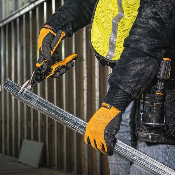 Nożyce typu ergo proste Dewalt DWHT14675-0 zostały zaprojektowane ze zmniejszoną rozpiętością rękojeści, zapewniając mniejszy poziom siły mięśniowej wymaganej podczas cięcia twardych materiałów. To narzędzie jest tradycyjnie używane do cięcia aluminium, sidingów winylowych, ekranów, tektury, skóry, miedzi i blach o grubości od 18 do 22ż. Ząbkowana krawędź tnąca noża zapobiega ślizganiu się materiałów podczas użytkowania, a antypoślizgowy, dwumateriałowy uchwyt amortyzujący zapewnia pewny i wygodny chwyt.