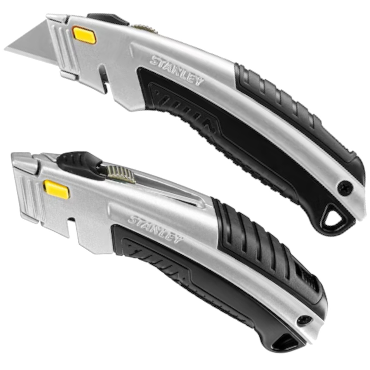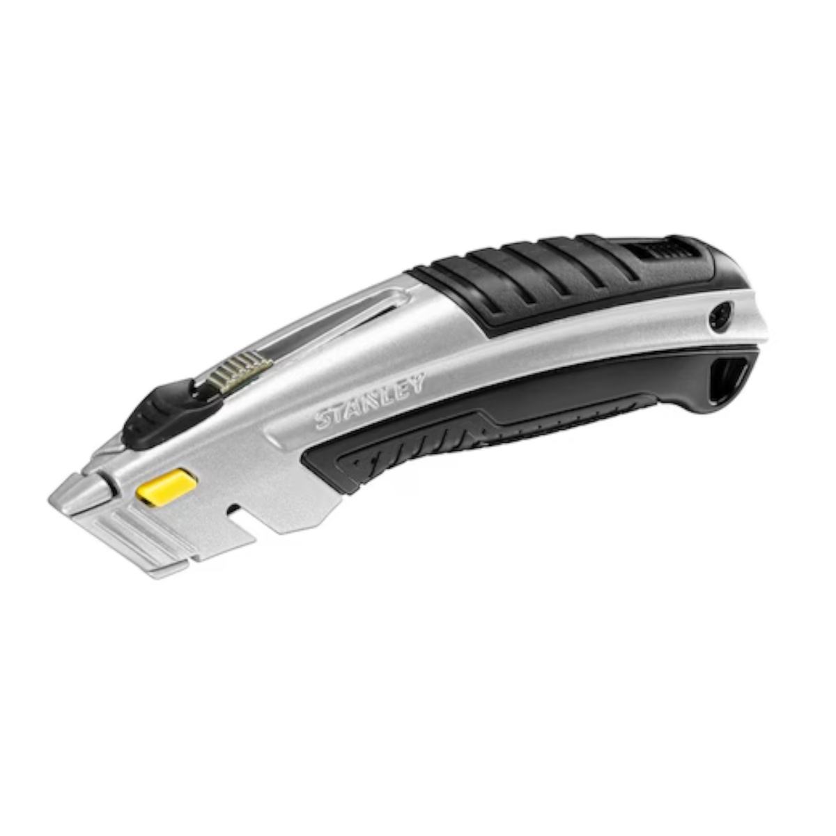 - Nóż z szybkowymiennym ostrzem trapezowym Dynagrip Stanley 0-10-788. Długość noża: 180 mm. Przeznaczenie: uniwersalny. Rodzaj ostrza: niełamane. Materiał: aluminiowy korpus. Kolor: Srebrny/czarny. Możliwość cięcia przy schowanym ostrzu