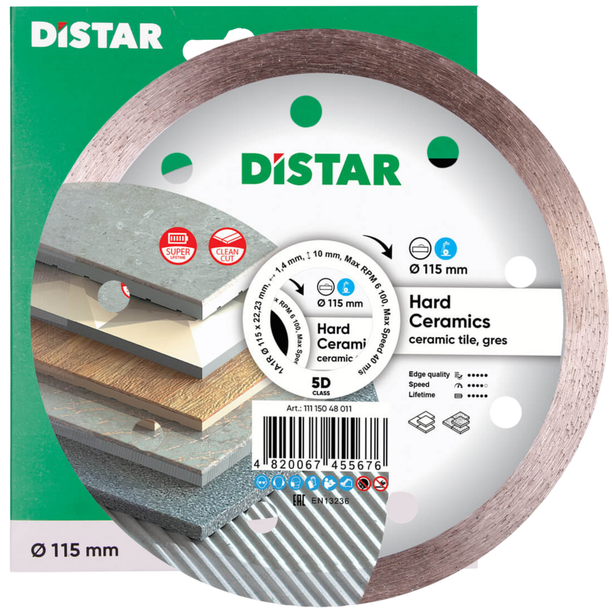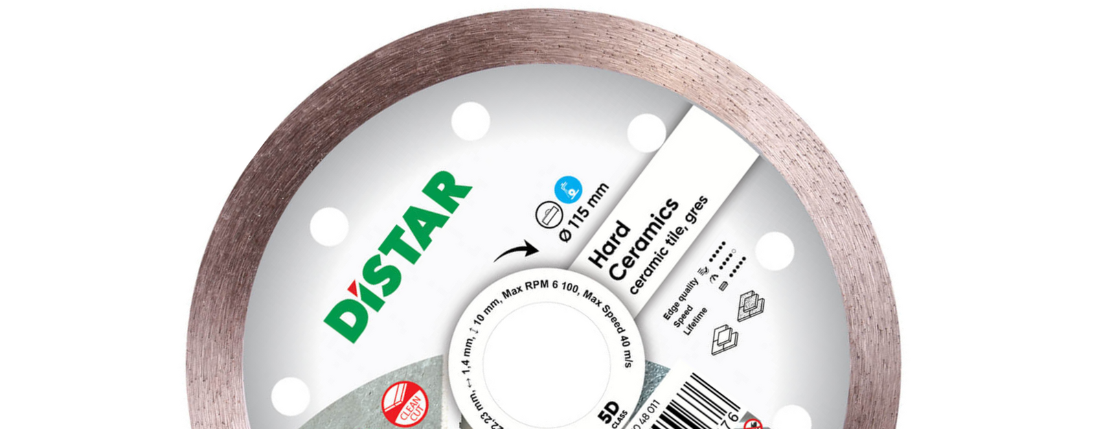 Diamentowa tarcza Distar Hard Ceramics przeznaczona jest do wysokiej jakości cięcia płytek ceramicznych z powłoką dekoracyjną i bez niej, a także gresu porcelanowego. Prędkość skrawania na minutę wynosi 1,1 metra, przy resursie 1000 metrów bieżących, dzięki swoim możliwościom do obróbki materiału, osiągana jest opłacalna eksploatacja narzędzia dzięki mniejszym kosztom. Stosowana głównie do pracy z tłoczoną glazurą, ceramiką ścienną i podłogową, kamionką porcelanową, a także w rzadkich przypadkach wszystkimi rodzajami granitu i marmuru. Ma szeroki zakres średnic tarczy od 115 mm do 400 mm, który jest stosowany na przecinarkach do płytek o mocy 0,8-1,5 kW z prędkością obrotową 2900 obrotów na minutę. Dla średnic 200-250 mm i 2-2,5 kW dla 300-400 mm. Jednocześnie wymagane jest zaopatrzenie w wodę w ilości 5 litrów na minutę procesu. Przy innych wskaźnikach wydajność znacząco się zmienia. Hard Ceramics można kupić w przystępnej cenie dla szybkiej i czystej pracy.