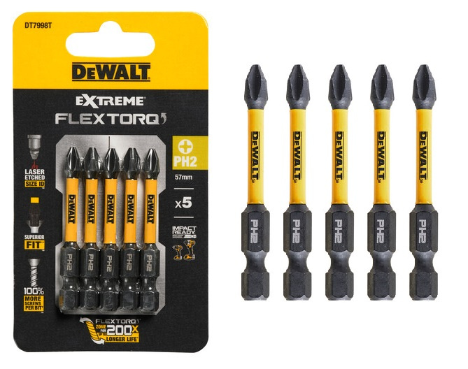 - Końcówki wkrętarskie EXTREME IMPACT Torsion PH2/57 mm (opak. 5 szt.) DeWALT DT7998T-QZ. Długość końcówki: 50 mm. Materiał główny: Stal. Typ końcówki: Phillips. Waga produktu: 0.05 kg. Opakowanie: blister