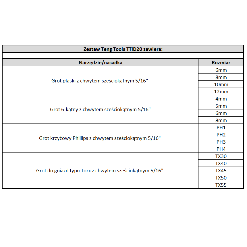 - Wkrętak Teng Tools TTID20 - zestaw 20 elementów. Waga: 1.1kg. Jakość przemysłowa. Dołączone opakowanie transportowe. Kod produktu: 102100104