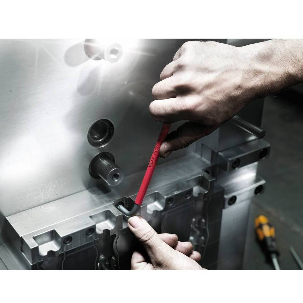 Klucze trzpieniowe z kulką Wera 05073593001 to zestaw 9 profesjonalnych kluczy trzpieniowych o dużej wytrzymałości. Każdy z kluczy na swoim dłuższym końcu posiada tzw. łamaną kulę, która umożliwia dokręcanie i odkręcanie śrub z łbem heksagonalnym pod kątem nawet 30 stopni. Pozwala to odkręcić bądź dokręcić śrubę w trudno dostępnych miejscach. Klucze dostarczane są w rozkładanej oprawce z tworzywa sztucznego, co ułatwia ich organizację i transport.