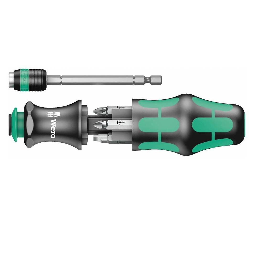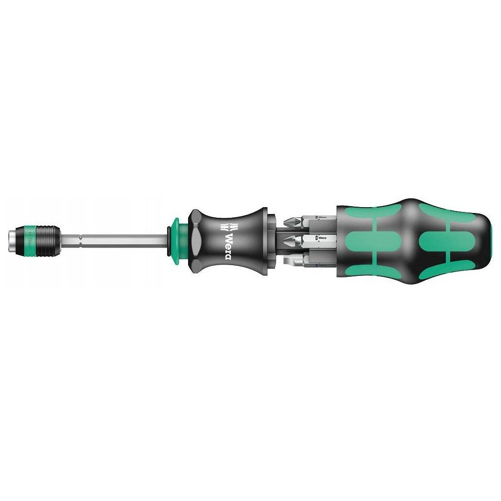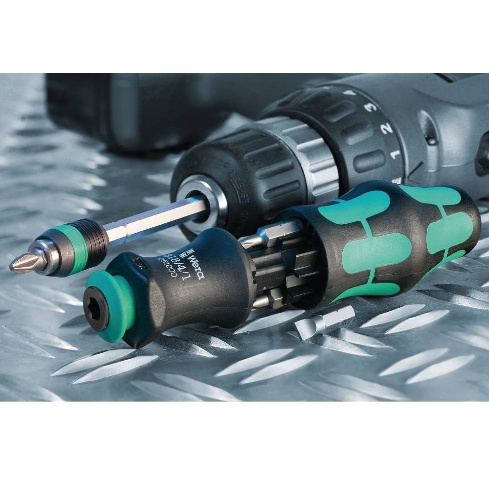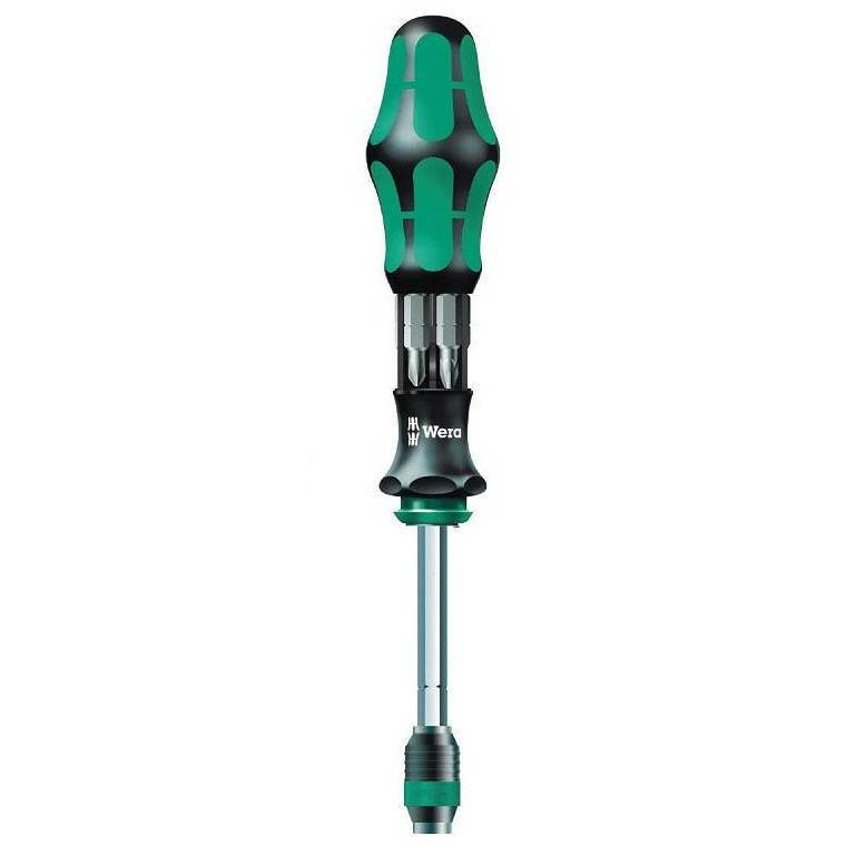 Wera 05051019001 to zestaw wkrętaka ręcznego oraz trzpienia do pracy mechanicznej przy użyciu elektronarzędzi. Wkrętak ręczny posiada w magazynek przechowujący bity. Zapewnia to dostęp do podstawowych końcówek bez potrzeby zmiany narzędzia. Rodzaj bitu oraz jego wielkość można rozpoznać dzięki systemowi "Take it easy" poprzez identyfikację kolorystyczną. Wkrętak przeznaczony jest do sześciokątnych grotów 1/4" wg DIN ISO 1173-C 6,3 oraz końcówek E 6,3 (ISO 1173), a także grotów i końcówek z serii Wera 1 i 4.