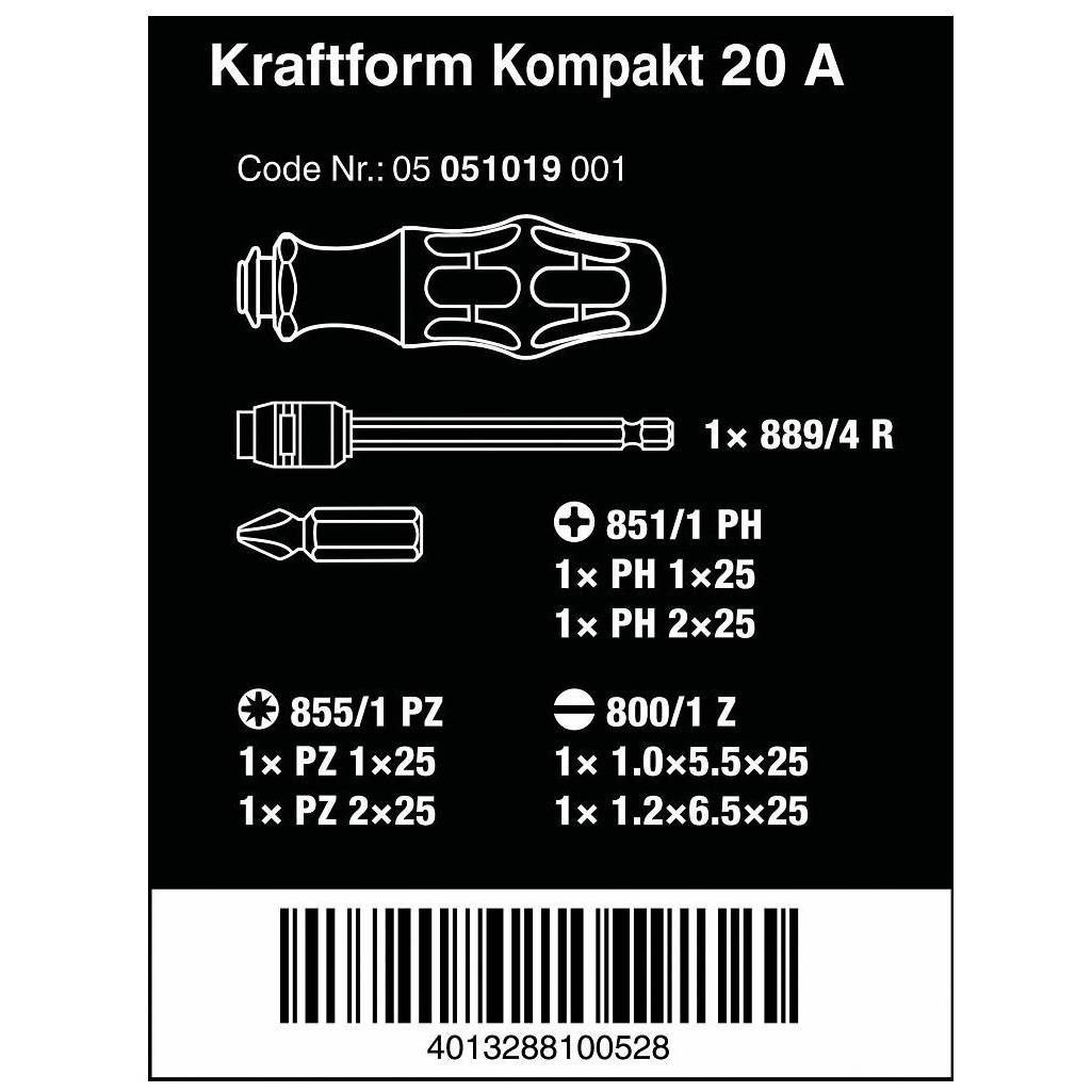 - Zestaw wkrętaków płaskich i krzyżowych Wera Kraftform Kompakt 20 A.Rozmiar końcówki (wkrętaka): 1/4" (6,3 mm). Spełniana norma: DIN ISO 1173. Kod produktu: 05051019001