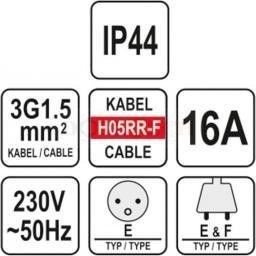 - Przewód wykonany jest z 3 żył miedzianych o przekroju 1,5mm² każdy, umożliwia przez to podłączenie tego przedłużacza najróżniejszych urządzeń często używanych na budowie, w warsztacie czy zakładzie produkcyjnym.