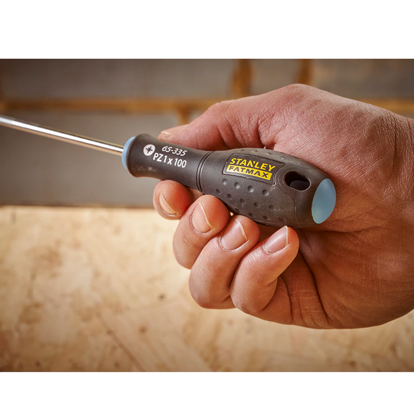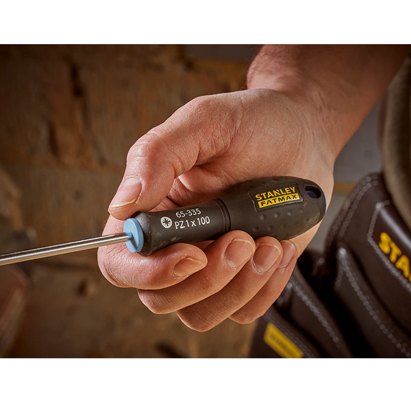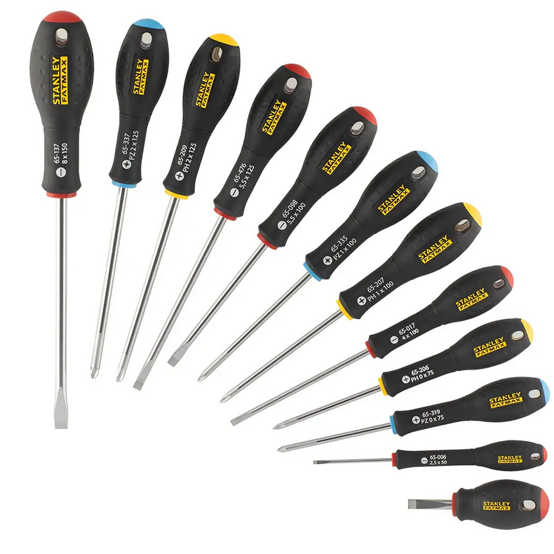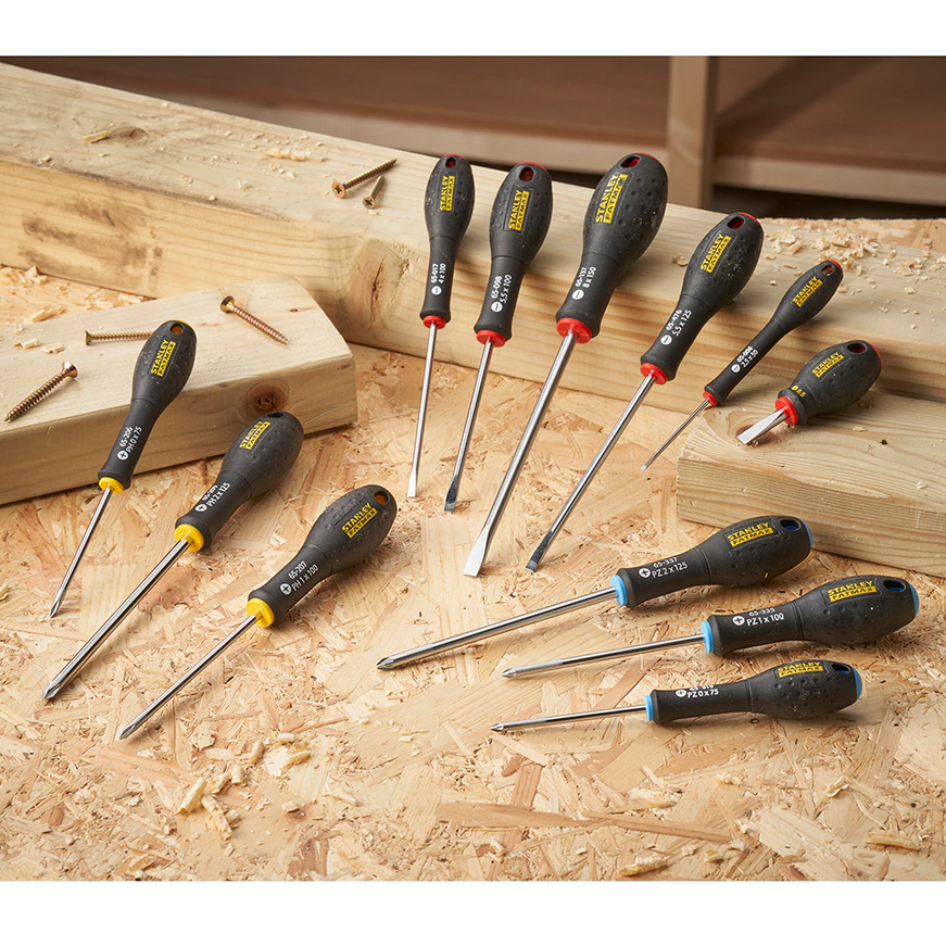 Stanley FMHT65426-0 to zestaw wkrętaków do uniwersalnego stosowania. Posiadają wzmocnioną końcówkę, która charakteryzuje się dłuższą żywotnością w porównaniu do wkrętaków z końcówkami niewzmocnionymi. Wkrętaki posiadają ochronę przed korozją - zostały poddane procesowi piaskowania. Kolory główek pozwalają na łatwą identyfikację końcówki danego wkrętaka. Czerwona dla wkrętaków płaskich, niebieska dla wkrętaków PZ oraz żółta dla wkrętaków o oznaczeniu PH.
