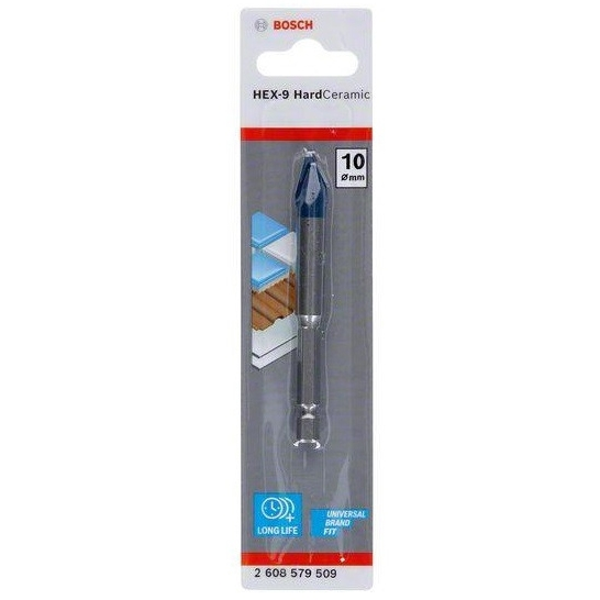 Bosch 2608579509 to wiertło przeznaczone do pracy w materiałach ceramicznych. Poradzi sobie ze robieniem otworów nawet w najtwardszych gatunkach płytek oraz szkła. Posiada głowicę wykonaną z węglików z wieloma ostrymi krawędziami, dzięki którym proces samego wiercenia przebiega sprawnie. Dodatkowo końcówka z węglika zmniejsza zużycie się krawędzi tnących. Ponadto wiertło posiada końcówkę centrującą, która ułatwia rozpoczęcie nawiertu otworu w płytce. Wiertło Bosch HEX-9 HardCeramic charakteryzuje się również trzpieniem HEX, dzięki któremu wiertło nie ślizga się we wrzecionie i przenosi pełną moc wiertarki na wiertło. Nie wymaga chłodzenia podczas pracy.