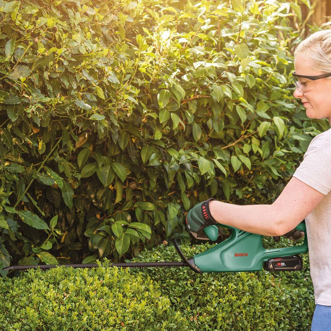 Bosch EasyHedgeCut 18-45 to akumulatorowe nożyce do żywopłotu. Dzięki zasilaniu akumulatorowemu nie ma konieczności ciągnięcia za sobą długich przedłużaczy. Nie występuje także ryzyko jego przecięcia. Pozwala to na zabranie nożyc w najbardziej odległe miejsca na działce i pracę bez dostępu do zasilania sieciowego. Nożyce doskonale sprawdzą się do przycinania roślinności ogrodowej, w szczególności tui, cisów oraz żywopłotów. Przy pomocy nożyc można również w łatwy sposób uformować wybrany kształt rośliny. Długa listwa tnąca zapewnia dużą szybkość ścinania.