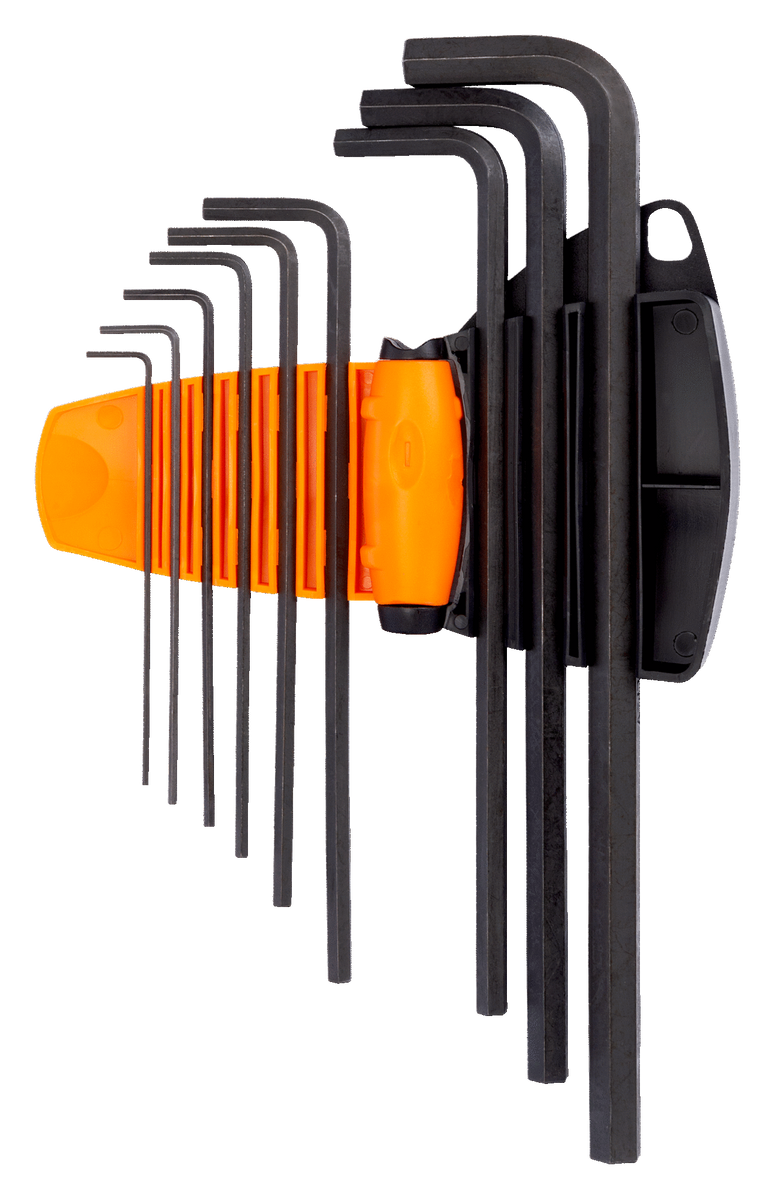 - Zestaw wydłużonych, czernionych kluczy imbusowych o 9 rozmiarach