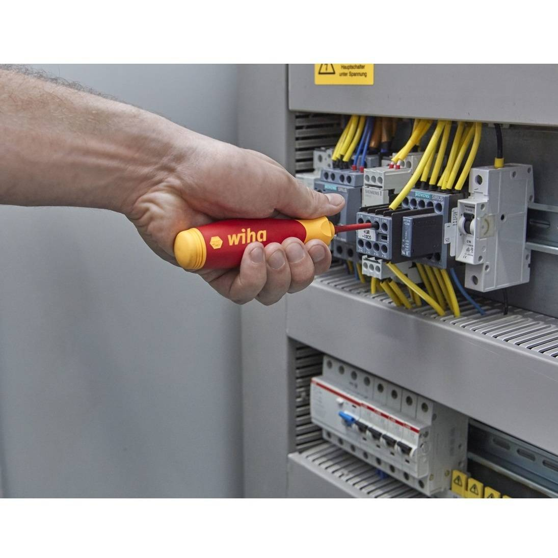 Wiha 45296 to mały, poręczny wkrętak z magazynkiem z bitami chowanym w uchwycie. Przeznaczony jest do prac pod napięciem. Głównym jego odbiorcą są elektrycy zajmujący się instalacjami elektrycznymi, a także osoby wykonujące prace wykończeniowe, w tym także montaż gniazdek oraz innych elementów mogących znajdować się pod napięciem. W magazynku znajdują się najbardziej popularne bity, które posiadają izolację ochronną. Są to: bit z płaską końcówką 3,5mm, bit PH1,PH2 oraz PZ2. Bity z magazynkiem są chowane w rękojeść zamykaną na magnes, dzięki czemu wsuwanie wyjętego już magazynku nie stanowi problemu. Górna część wkrętaka to tzw. kapturek, który jest obrotowy. Przekłada się to na wygodę użytkowania. Produkt wykonany zgodnie z norną IEC 60900.