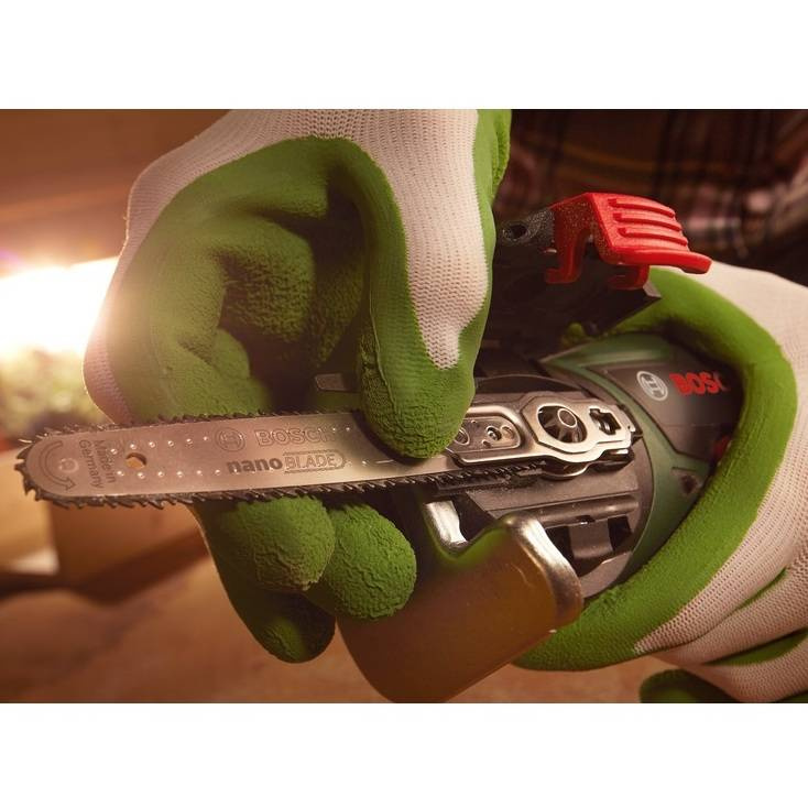 Bosch EasyCut 12 to uniwersalna piła do zastosowań w domu oraz ogrodzie. Jest to forma miniaturowej piły łańcuchowej. Przy pomocy tego urządzenia bez wysiłku przetniesz materiały drzewne oraz drewnopochodne takie jak listwy, twarde i miękkie drewno, gałęzie oraz inne, przedmioty z tworzywa sztucznego bądź drewna znajdujące się wokół gospodarstwa domowego. Piła uniwersalna pozwala na przecięcie materiału drzewnego na maksymalną głębokość 65mm, natomiast tworzywa sztucznego na 30mm. W Bosch Easycut 12 zastosowano technologię NanoBlade, gdzie nie występują drgania podczas procesu cięcia. Dodatkową zaletą ostrzy NanoBlade jest to, że jest ono bezobsługowe. Nie wymaga ono smarowania, ostrzenia ani napinania, jak ma to miejsce w tradycyjnych pilarkach łańcuchowych. Ponadto demontaż ostrza jest banalnie prosty i nie wymaga stosowania dodatkowych narzędzi. Zaletą akumulatorowych narzędzi jest ich mobilność i możliwość wykorzystania w najbardziej oddalonym miejscu na działce bez konieczności ciągnięcia długich przewodów. Bosch EasyCut 12 posiada system akumulatorów POWER FOR ALL: jeden akumulator do obsługi wszystkich elektronarzędzi z oferty Home & Garden.