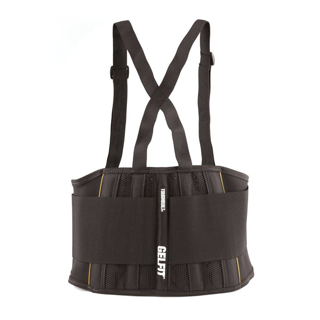 Pas lędźwiowy ToughBuilt TB-45-M wykonany jest z wytrzymałej tkaniny poliestrowej 1680D oraz gumy. Wygodna wyściółka GelFit wspiera oraz wzmacnia dolną partię pleców. Pas dodatkowo wymusza na użytkowniku właściwą technikę dźwigania ciężarów, dzięki czemu ogranicza to męczenie się kręgosłupa. Szelki z regulacją długości zwiększają wygodę noszenia akcesoria oraz zabezpieczają przed osuwaniem się go w dół. Regulowane elastyczne panele boczne umożliwiają idealne dopasowanie do ciała. Pas jest dodatkowo wzmocniony w miejscach, które będą dodatkowo narażone na nacisk, kiedy użytkownik będzie się schylać.