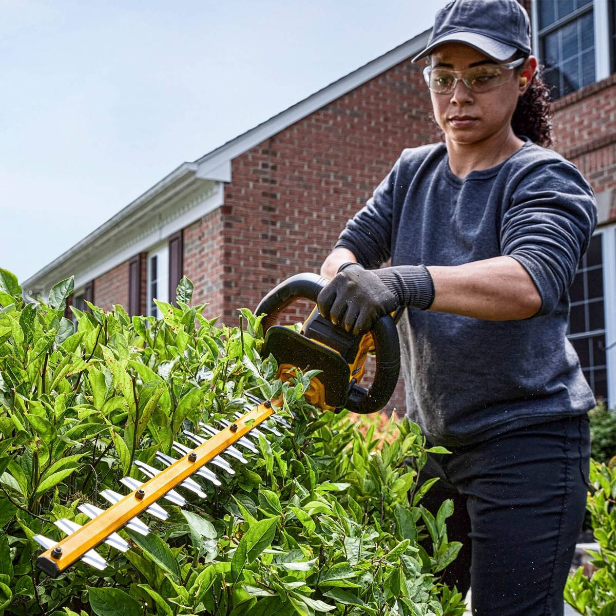 Nożyce do żywopłotu Dewalt DCMHT573N-XJ to bezprzewodowe nożyce akumulatorowe z silnikiem bezszczotkowym, pracujące z napięciem 54V (brak akumulatorów w zestawie). Narzędzie wyposażone jest w dwustronne ostrze o całkowitej długości 65 cm z zębami o rozstawie 31 mm. Nożyce dzięki mocnemu bezszczotkowemu silnikowi elektrycznemu i napięciu zasilania 54V umożliwia cięcie nawet grubszych gałęzi w krótkim czasie. Narzędzie w wersji wyposażenia DCMHT573N-XJ - nie zawiera akumulatorów i ładowarki.