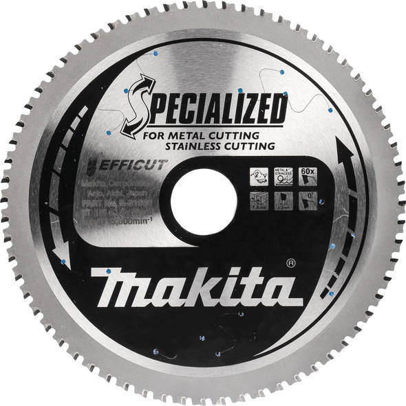 Tarcza tnąca EFFICUT Makita E-12843 piła tarczowa do przecinarki do metalu ze specjalnie zmodyfikowanymi zębami, których kształt oraz konstrukcja zapewnia dłuższą żywotność ostrza w twardych materiałach. Doskonale sprawdzi się podczas wykonywania cięć w metalach żelaznych.